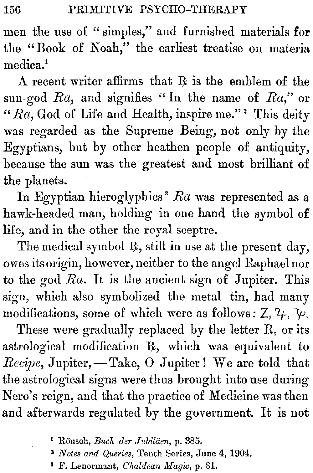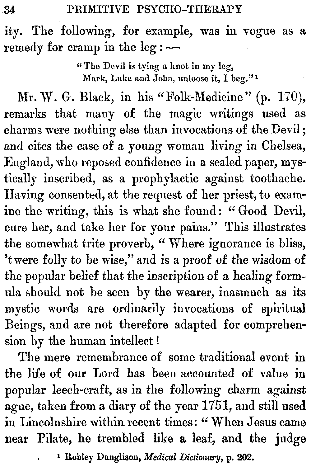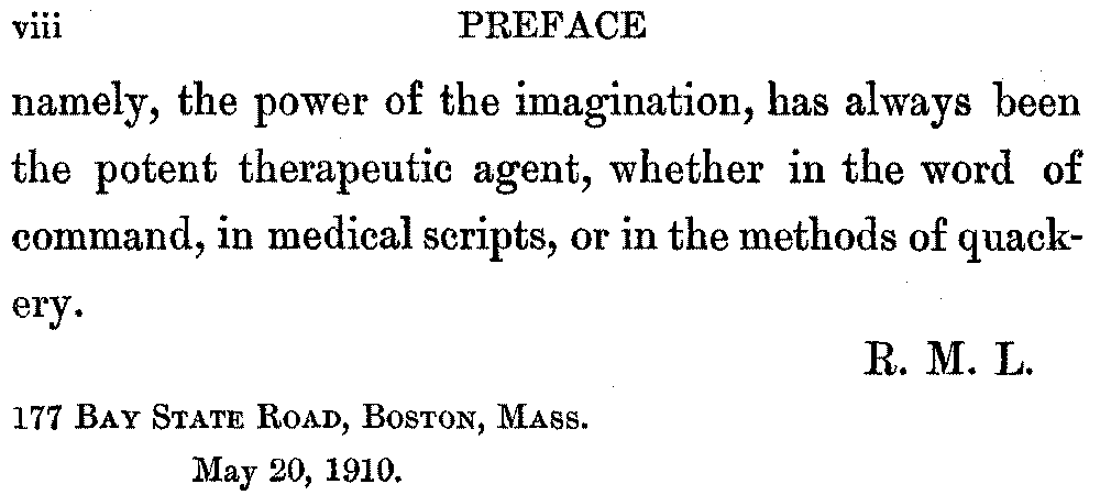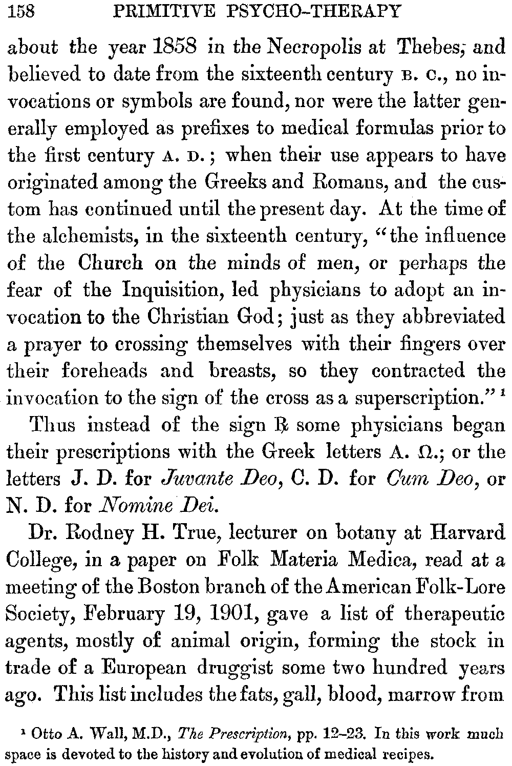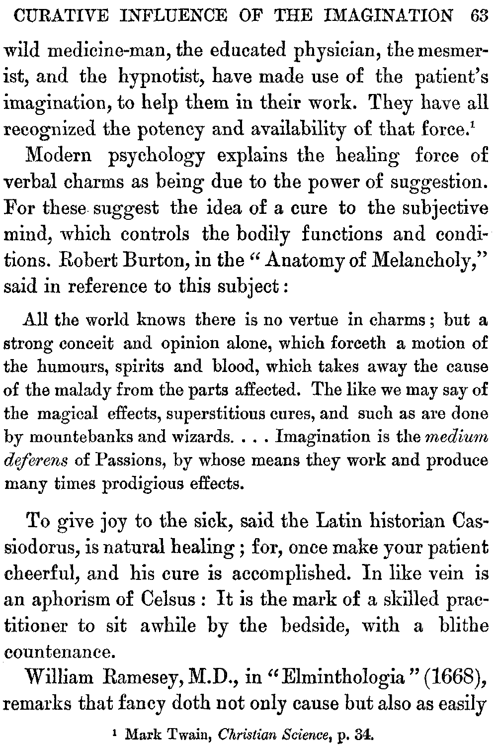 Certain historic modes of healing, including the use of medical amulets and charms, which have been regarded from early times as magical remedies, belong properly to the domain of Psychical Medicine. For the therapeutic virtues of medical amulets are not inherent in these objects, but are due to the influence exerted by them upon the imaginative faculties of the individuals who employ them. They afford powerful suggestions of healing. In this volume the writer has sought to emphasize the fact that the efficiency of many primitive therapeutic methods, and the success of charlatanry, are to be attributed to mental influence. The use of spells and incantations, the practice of laying-on of hands, the cult of relics, mesmerism, and metallo-therapy, have been important factors in the evolution of modern mental healing. The method of their operation, a mystery for ages, is revealed by the word suggestion. Thus may be traced some of the steps in the development of psycho-therapy. One ruling force, [viii]namely, the power of the imagination, has always been the potent therapeutic agent, whether in the word of command, in medical scripts, or in the methods of quackery.