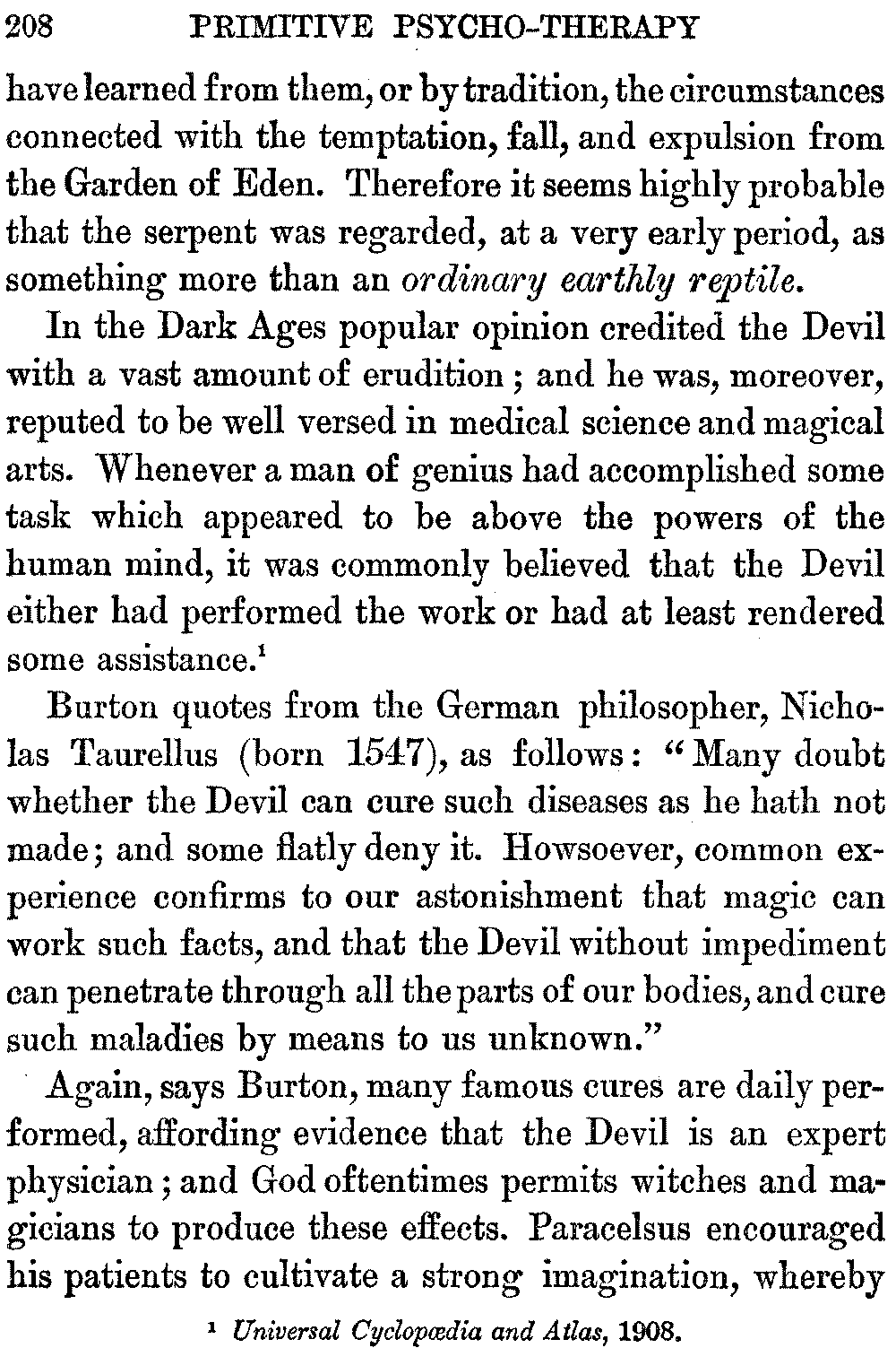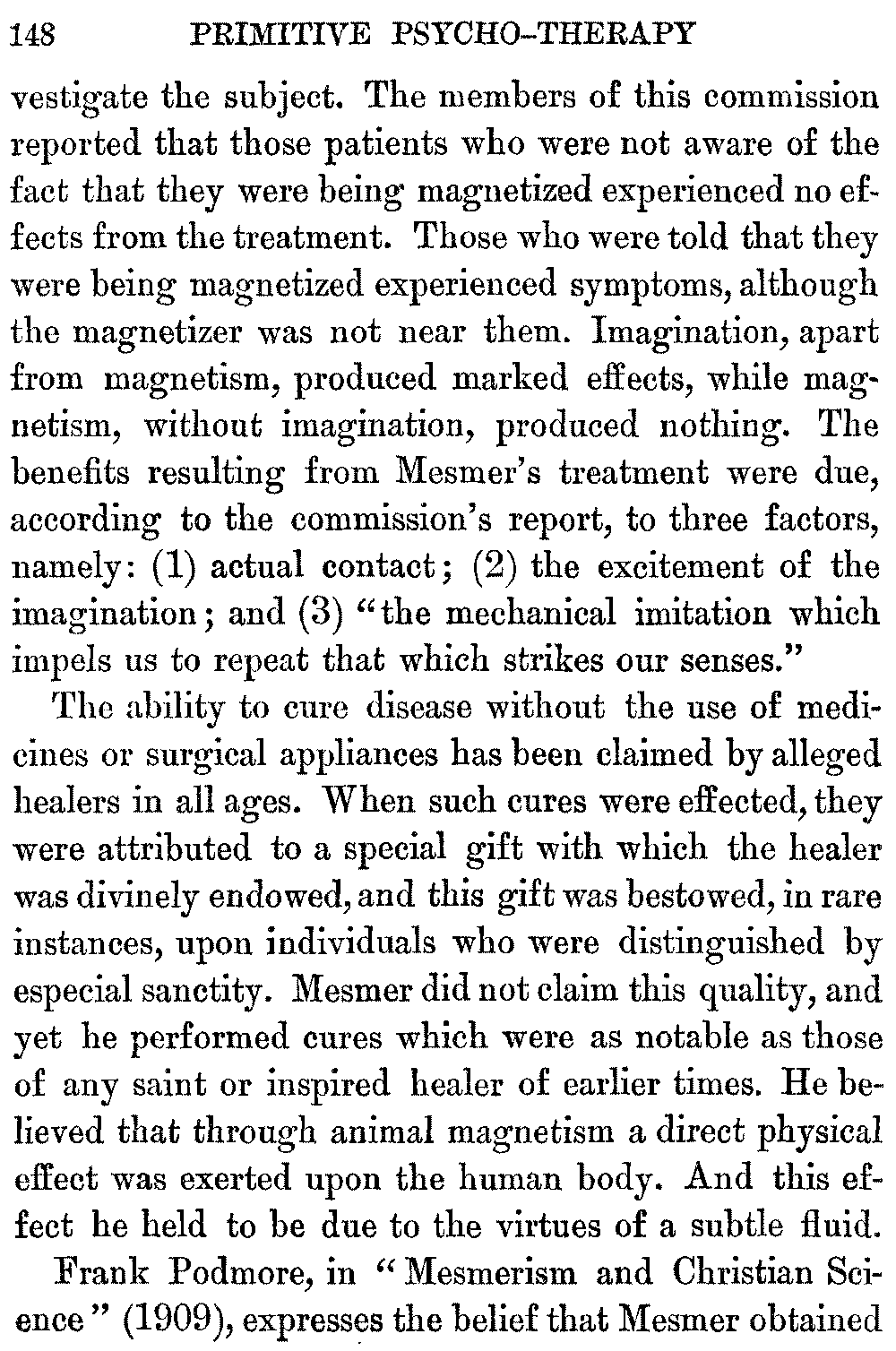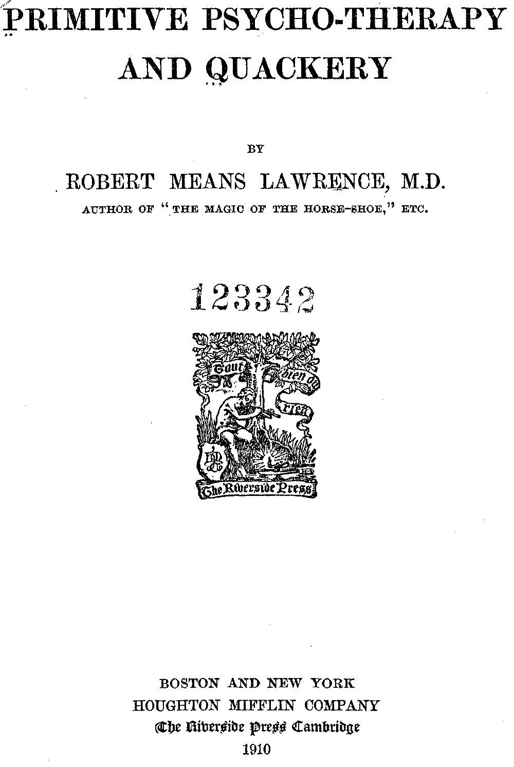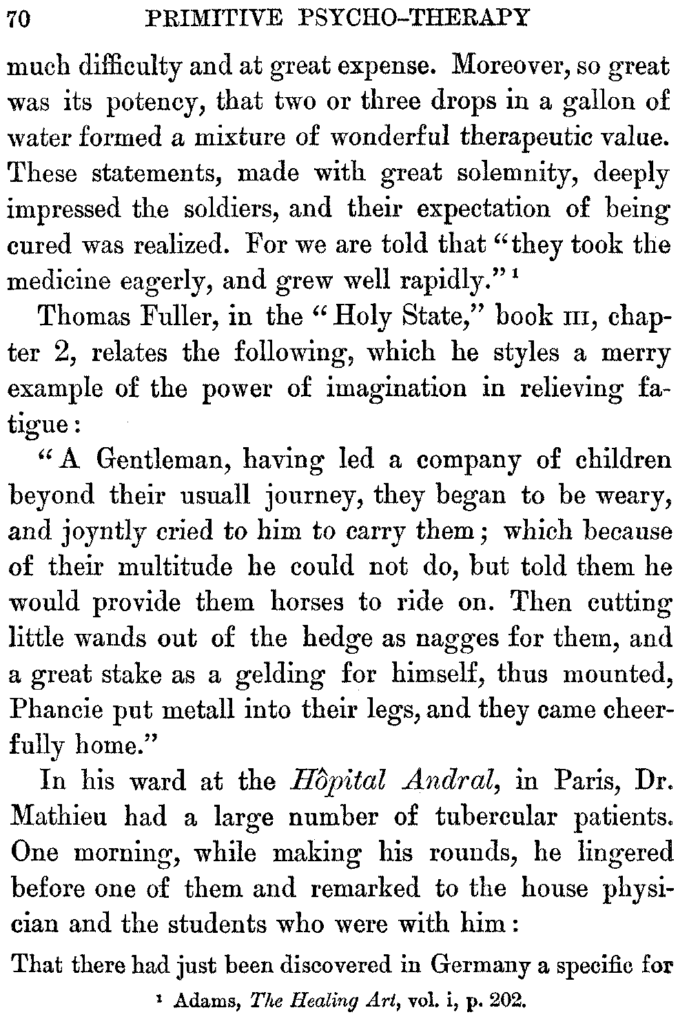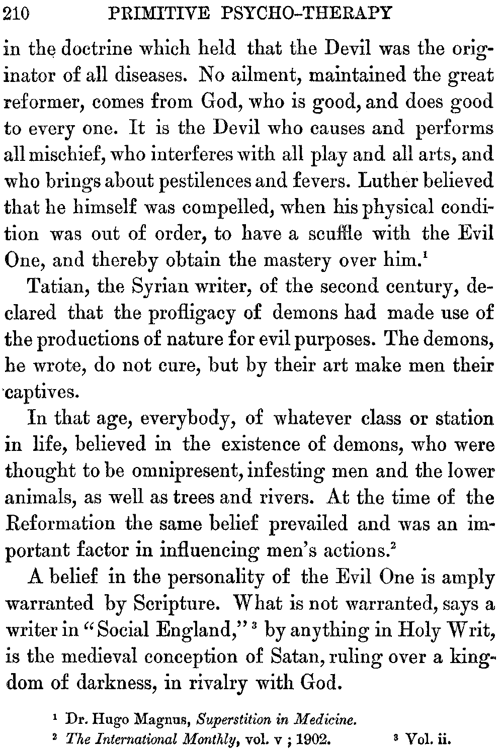 Certain historic modes of healing, including the use of medical amulets and charms, which have been regarded from early times as magical remedies, belong properly to the domain of Psychical Medicine. For the therapeutic virtues of medical amulets are not inherent in these objects, but are due to the influence exerted by them upon the imaginative faculties of the individuals who employ them. They afford powerful suggestions of healing. In this volume the writer has sought to emphasize the fact that the efficiency of many primitive therapeutic methods, and the success of charlatanry, are to be attributed to mental influence. The use of spells and incantations, the practice of laying-on of hands, the cult of relics, mesmerism, and metallo-therapy, have been important factors in the evolution of modern mental healing. The method of their operation, a mystery for ages, is revealed by the word suggestion. Thus may be traced some of the steps in the development of psycho-therapy. One ruling force, [viii]namely, the power of the imagination, has always been the potent therapeutic agent, whether in the word of command, in medical scripts, or in the methods of quackery.