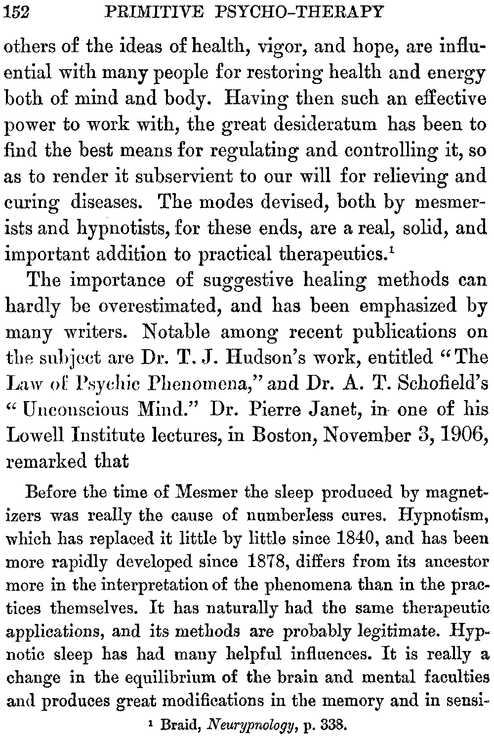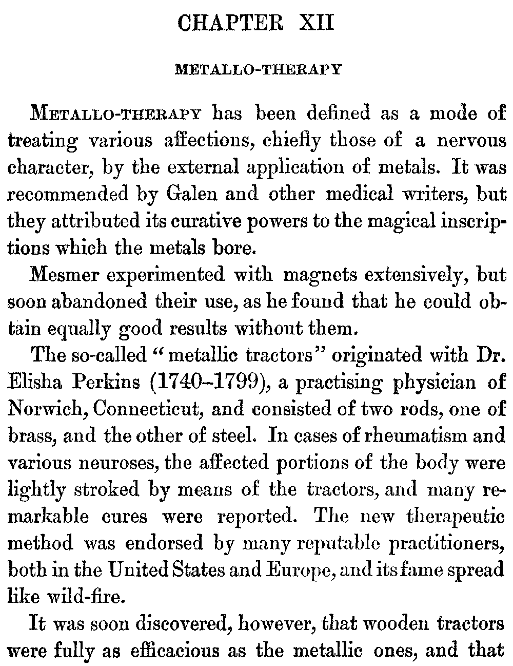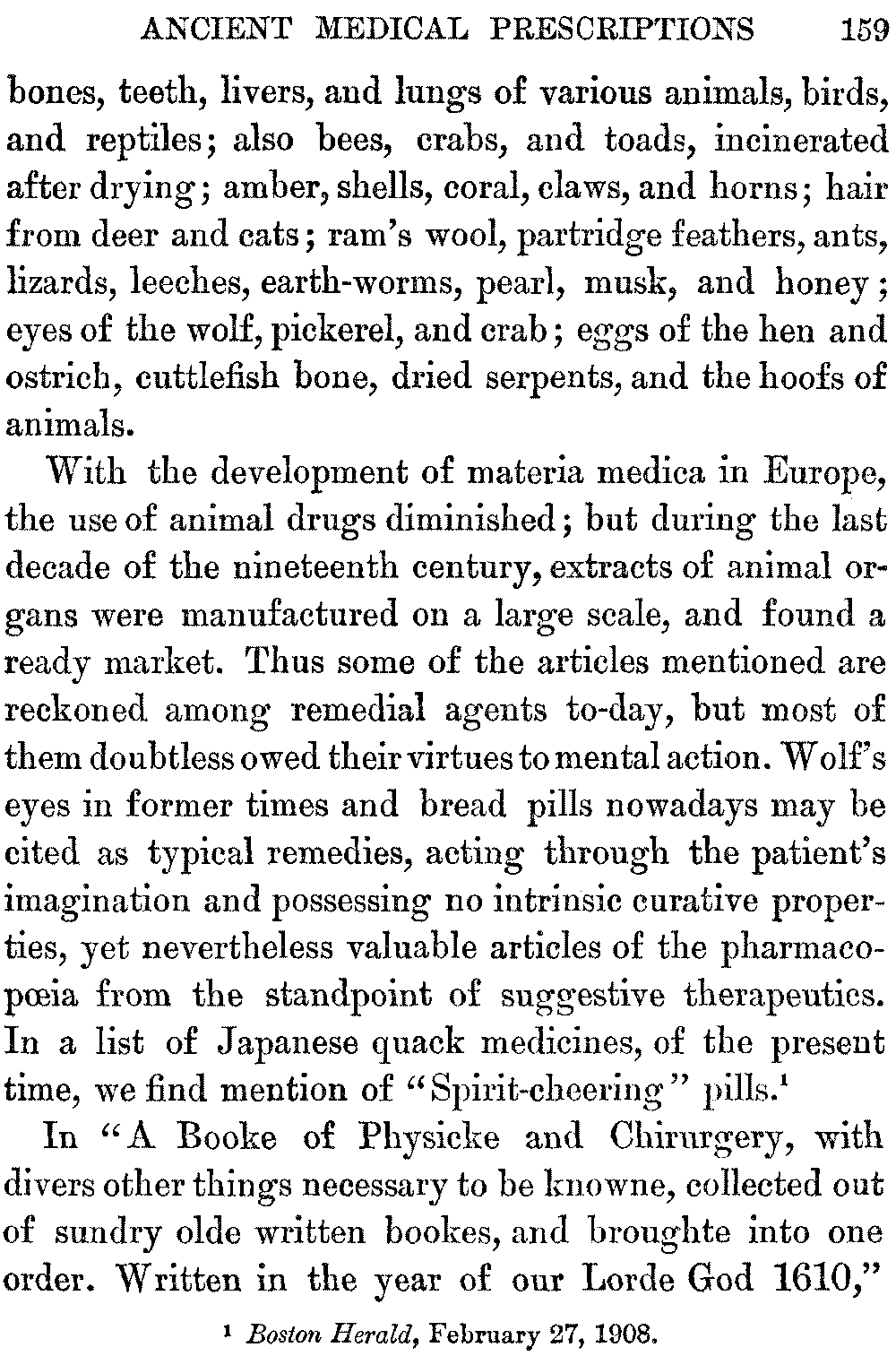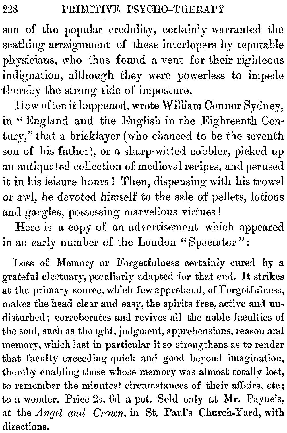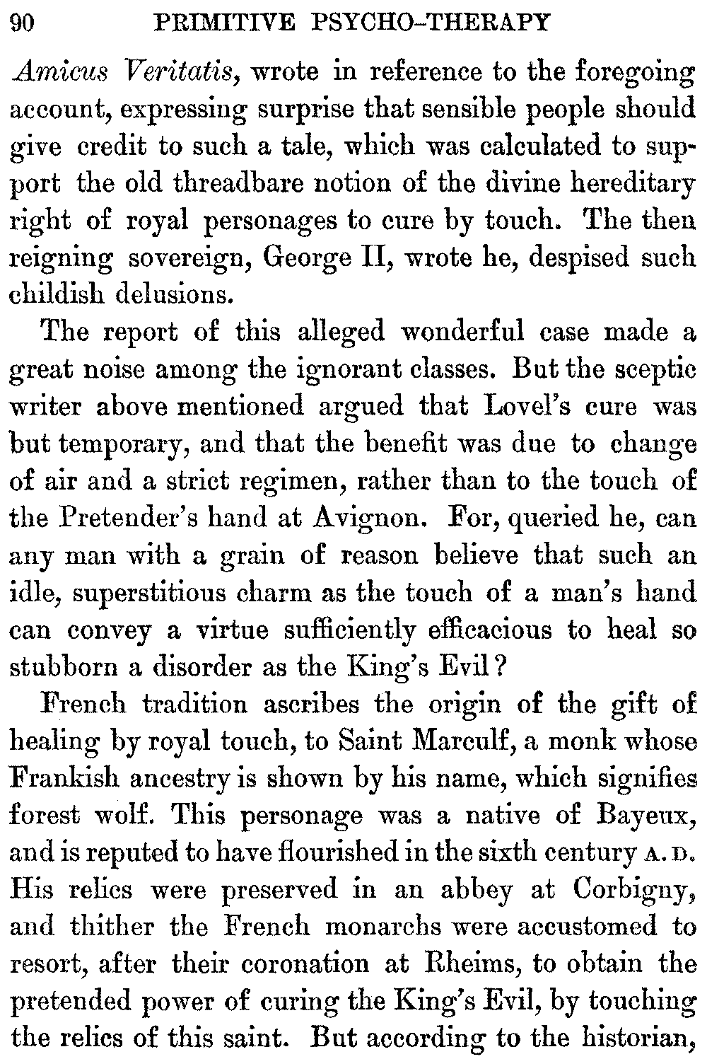 Certain historic modes of healing, including the use of medical amulets and charms, which have been regarded from early times as magical remedies, belong properly to the domain of Psychical Medicine. For the therapeutic virtues of medical amulets are not inherent in these objects, but are due to the influence exerted by them upon the imaginative faculties of the individuals who employ them. They afford powerful suggestions of healing. In this volume the writer has sought to emphasize the fact that the efficiency of many primitive therapeutic methods, and the success of charlatanry, are to be attributed to mental influence. The use of spells and incantations, the practice of laying-on of hands, the cult of relics, mesmerism, and metallo-therapy, have been important factors in the evolution of modern mental healing. The method of their operation, a mystery for ages, is revealed by the word suggestion. Thus may be traced some of the steps in the development of psycho-therapy. One ruling force, [viii]namely, the power of the imagination, has always been the potent therapeutic agent, whether in the word of command, in medical scripts, or in the methods of quackery.
