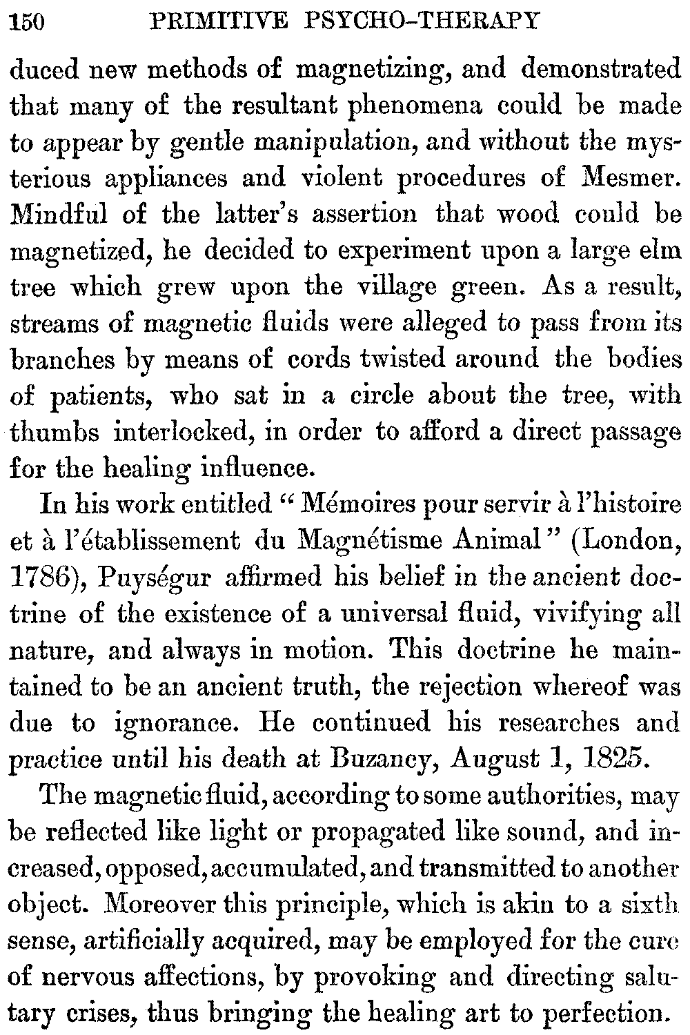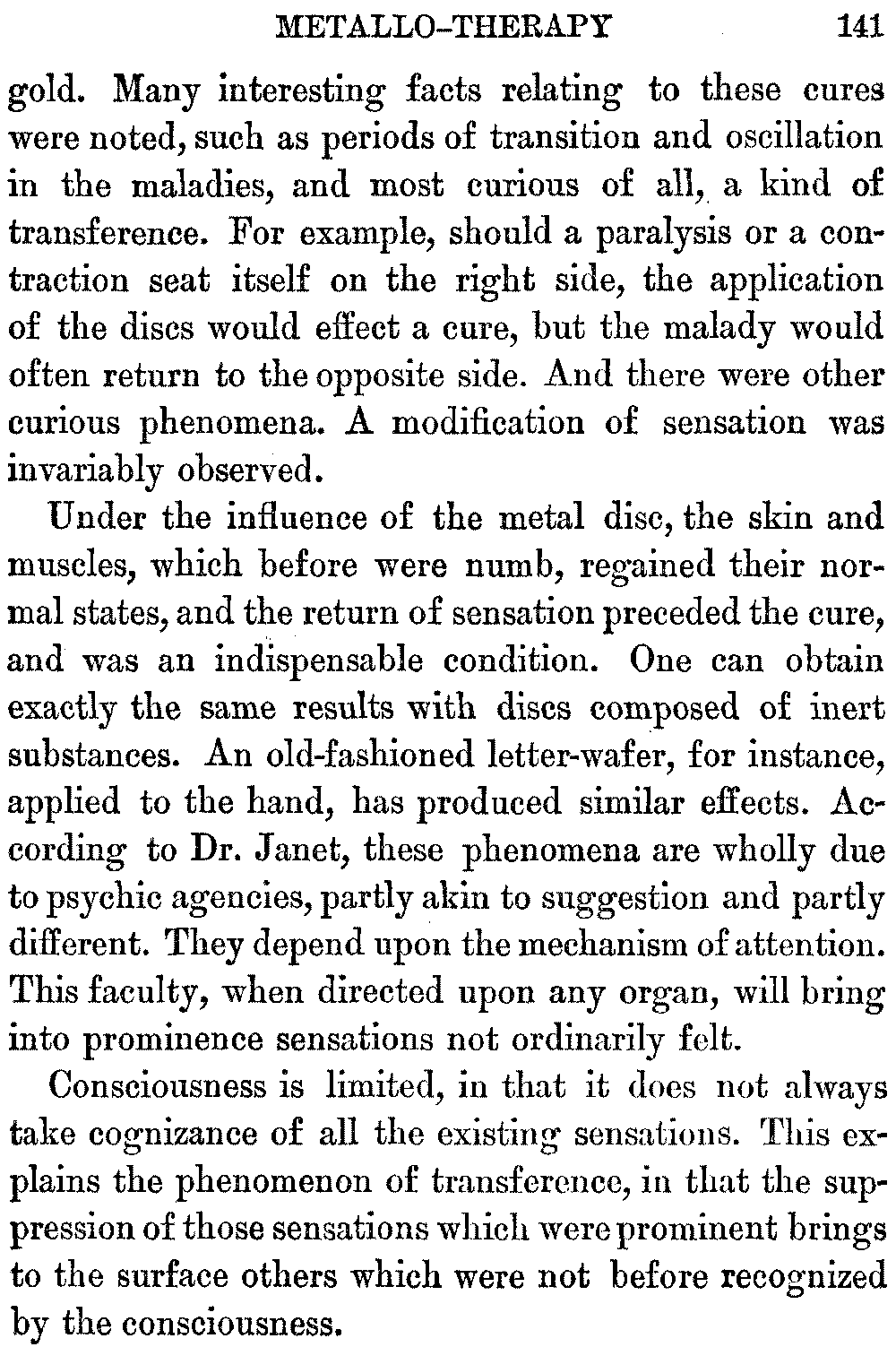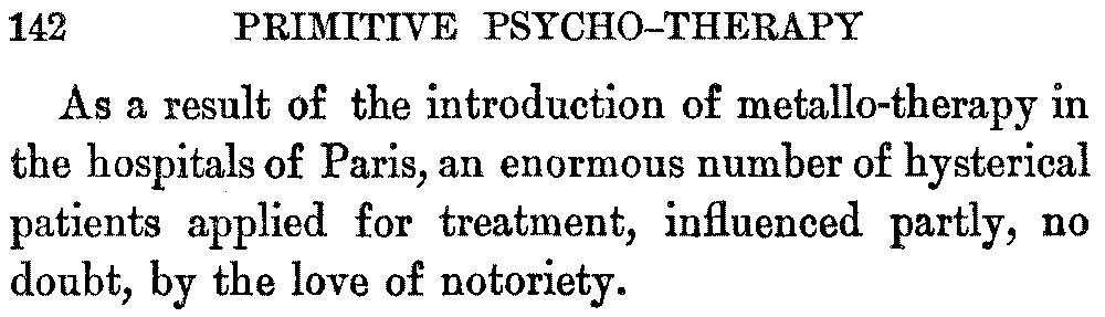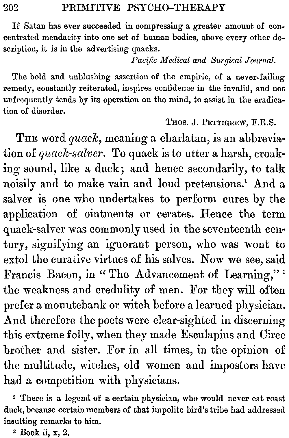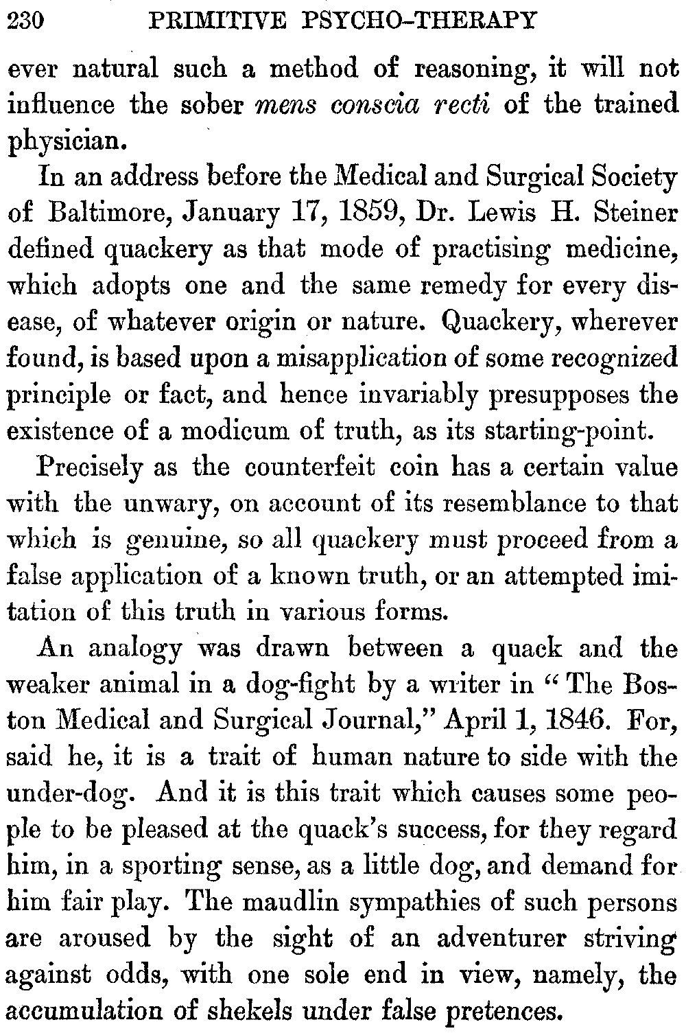 Certain historic modes of healing, including the use of medical amulets and charms, which have been regarded from early times as magical remedies, belong properly to the domain of Psychical Medicine. For the therapeutic virtues of medical amulets are not inherent in these objects, but are due to the influence exerted by them upon the imaginative faculties of the individuals who employ them. They afford powerful suggestions of healing. In this volume the writer has sought to emphasize the fact that the efficiency of many primitive therapeutic methods, and the success of charlatanry, are to be attributed to mental influence. The use of spells and incantations, the practice of laying-on of hands, the cult of relics, mesmerism, and metallo-therapy, have been important factors in the evolution of modern mental healing. The method of their operation, a mystery for ages, is revealed by the word suggestion. Thus may be traced some of the steps in the development of psycho-therapy. One ruling force, [viii]namely, the power of the imagination, has always been the potent therapeutic agent, whether in the word of command, in medical scripts, or in the methods of quackery.