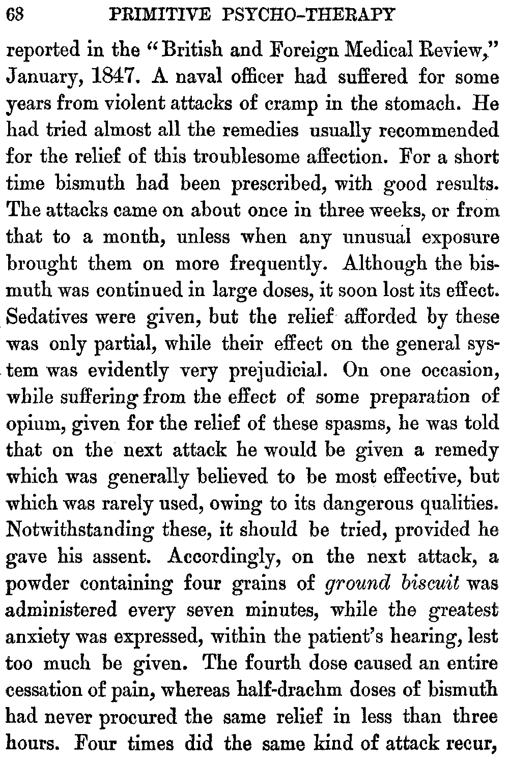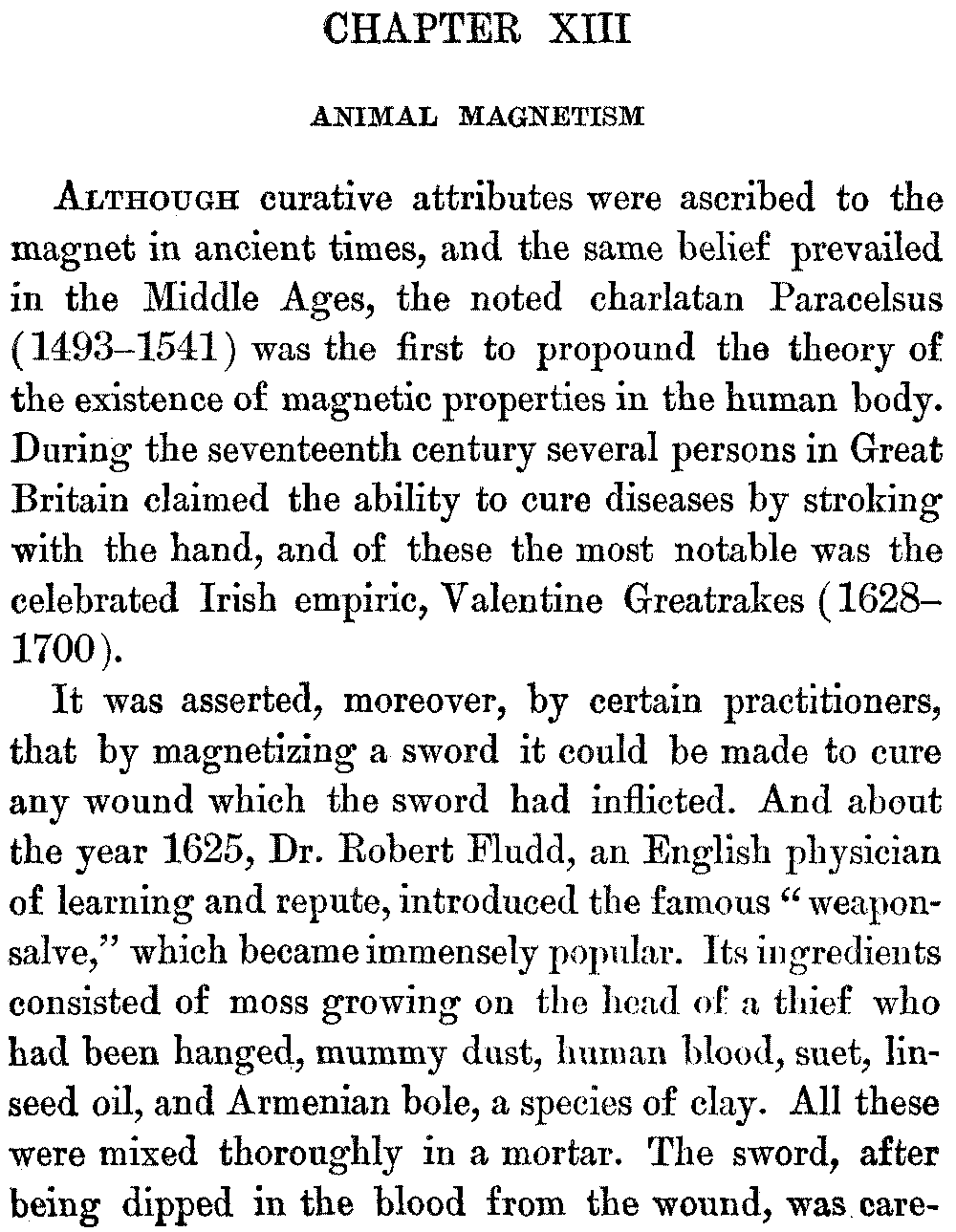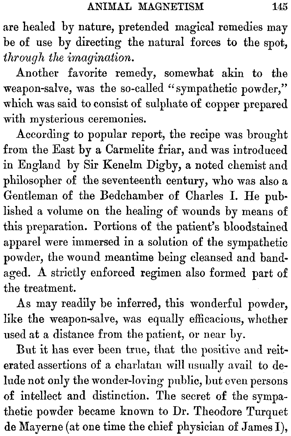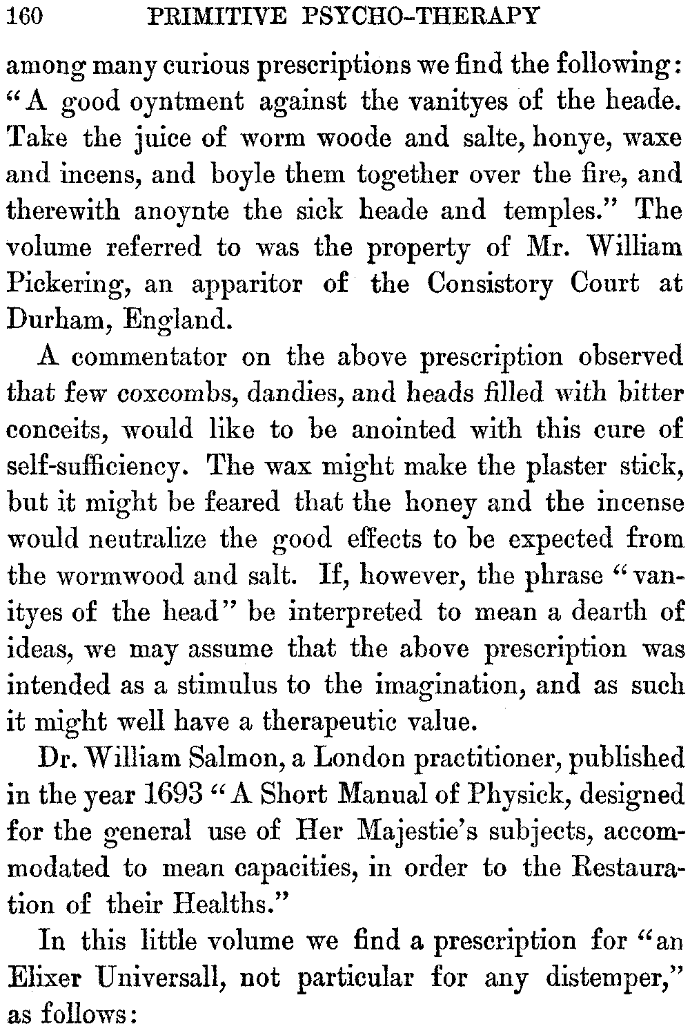 John Atkins wrote, in "The Navy Surgeon, or a Practical System of Surgery" (1737), that the best method of employing medical amulets consisted in adapting them to the patients' imaginations. "Let the newness and surprise," wrote he, "exceed the invention, and keep up the humor by a long roll of cures and vouchers; by these and such means, many distempers, especially of women, who are ill all over, or know not what they ail, have been cured more by a fancy to the physician than by his prescription. Quacks again, according to their boldness and way of addressing, command success by striking the fancies of an audience."