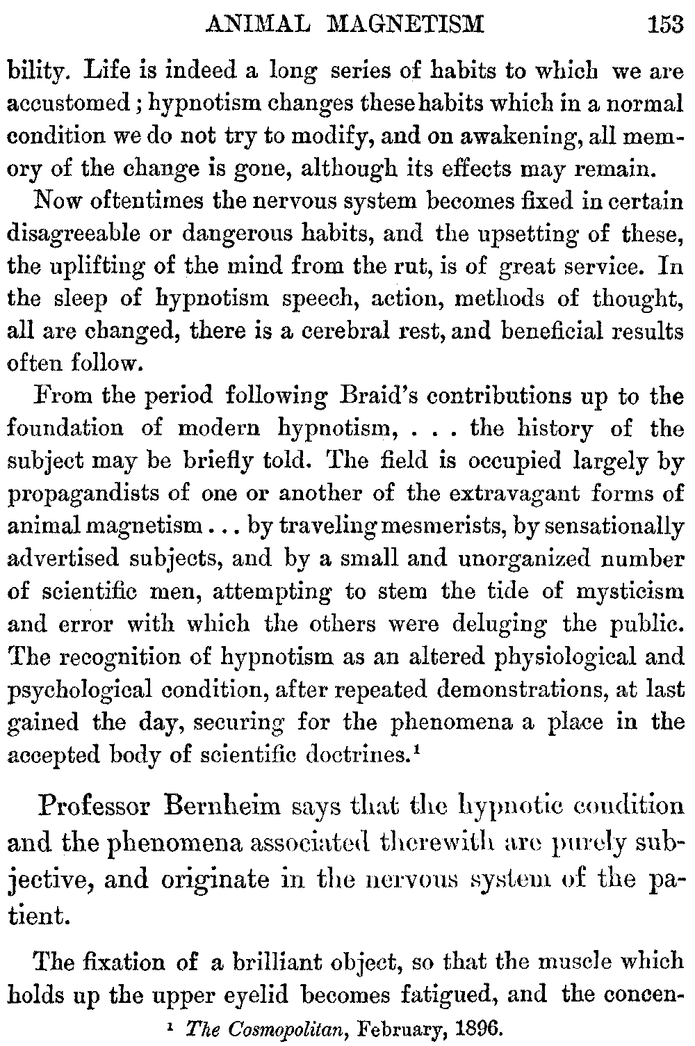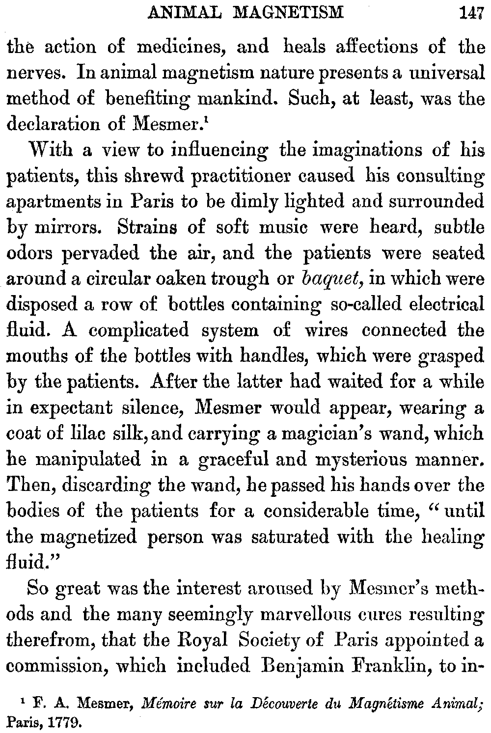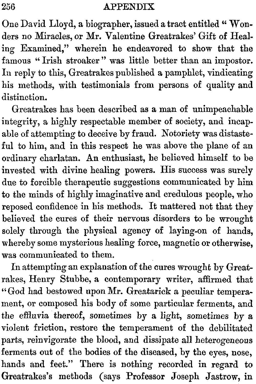 In attempting an explanation of the cures wrought by Greatrakes, Henry Stubbe, a contemporary writer, affirmed that "God had bestowed upon Mr. Greatarick a peculiar temperament, or composed his body of some particular ferments, and the effluvia thereof, sometimes by a light, sometimes by a violent friction, restore the temperament of the debilitated parts, reinvigorate the blood, and dissipate all heterogeneous ferments out of the bodies of the diseased, by the eyes, nose, hands and feet." There is nothing recorded in regard to Greatrakes's methods (says Professor Joseph Jastrow, in [257]"Fact and Fable in Psychology"), which definitely suggests the production of the hypnotic state; but direct suggestion, reinforced by manipulation, obviously had much to do with the cures.