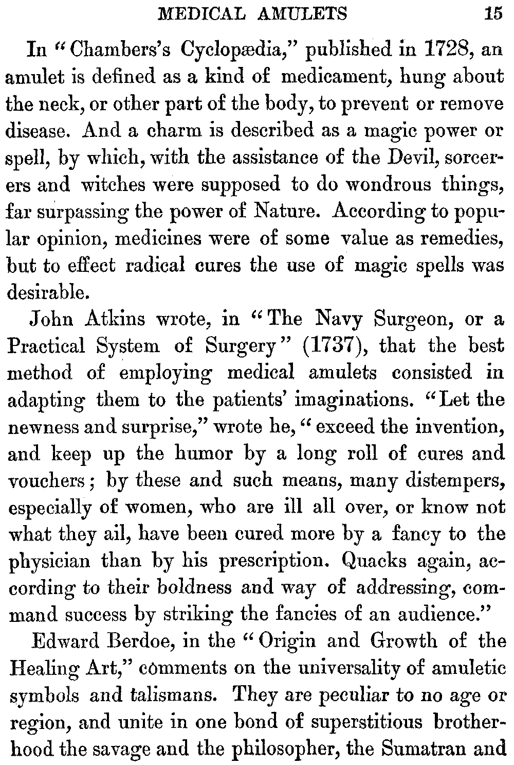 In "Chambers's Cyclopædia," published in 1728, an amulet is defined as a kind of medicament, hung about the neck, or other part of the body, to prevent or remove disease. And a charm is described as a magic power or spell, by which, with the assistance of the Devil, sorcerers and witches were supposed to do wondrous things, far surpassing the power of Nature. According to popular opinion, medicines were of some value as remedies, but to effect radical cures the use of magic spells was desirable.