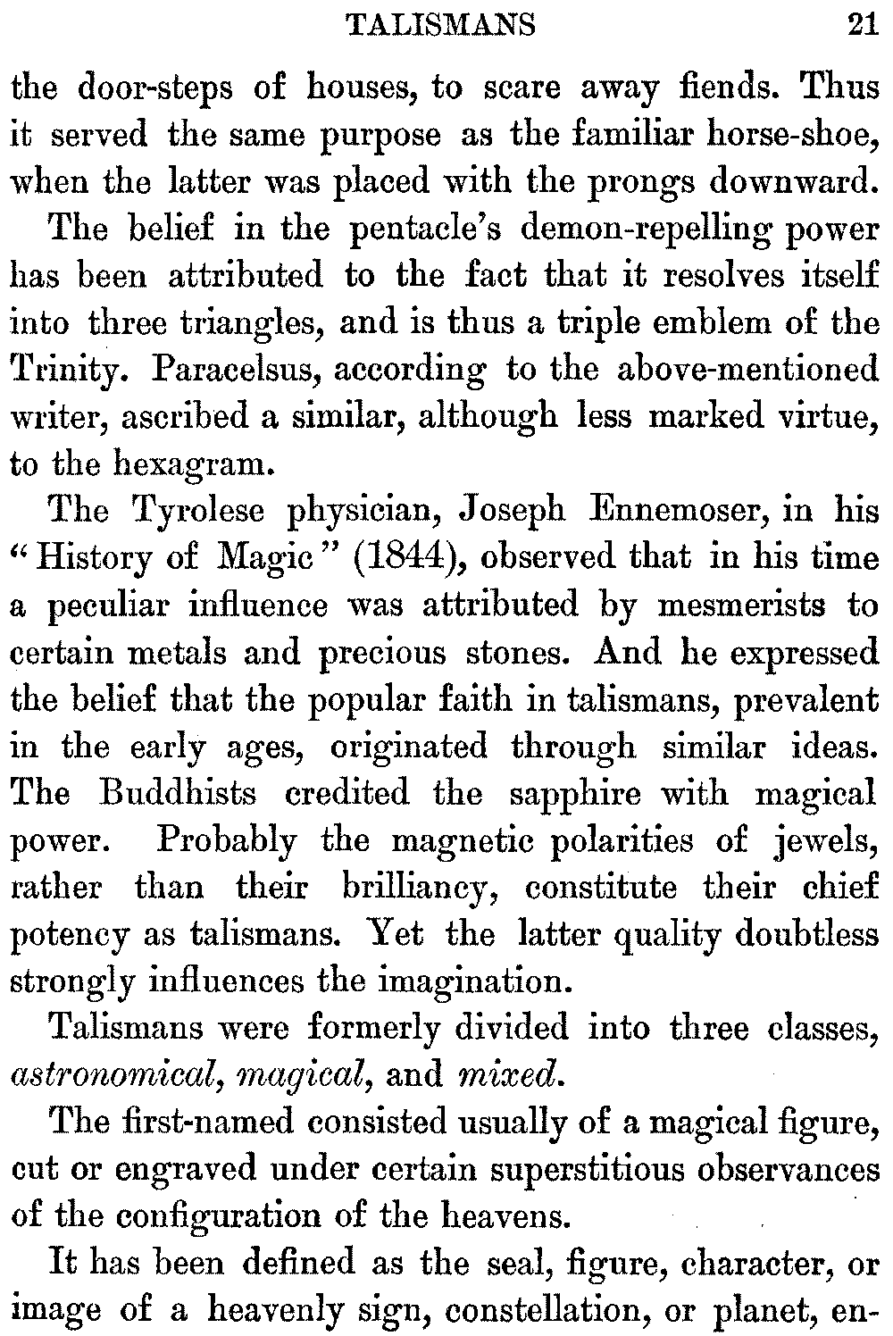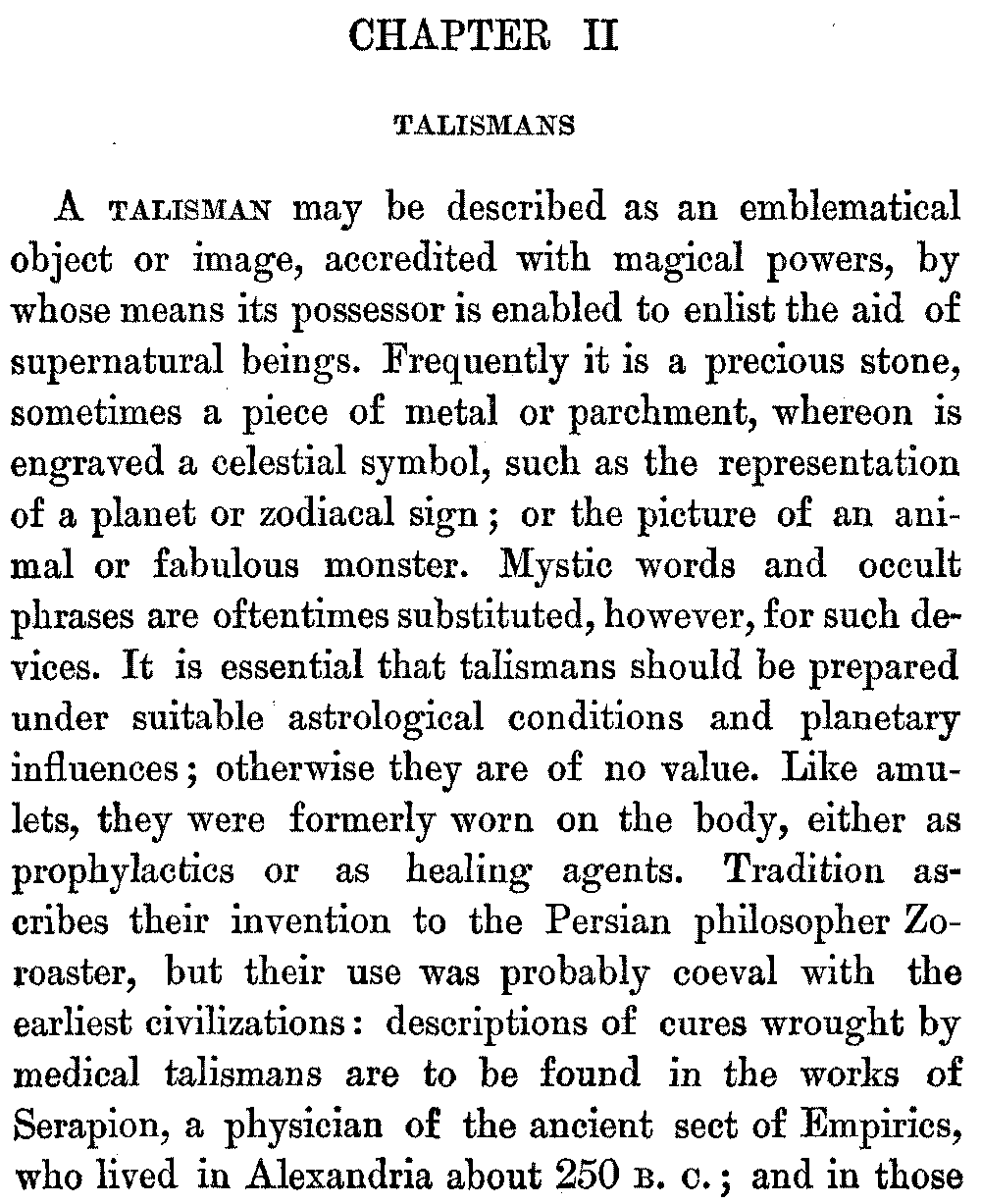 In the time of the Emperor Hadrian (a. d. 76-138), and of his successors, the Antonines, the resources of occult science, known only to the initiated few, were believed to be sufficiently powerful, through the agency of spells and charms, to control the actions of evil spirits.[6:2] The early Christians readily adopted the pagan custom of wearing amulets as remedies against disease, and as bodily safeguards, in spite of the emphatic condemnation of the Church.