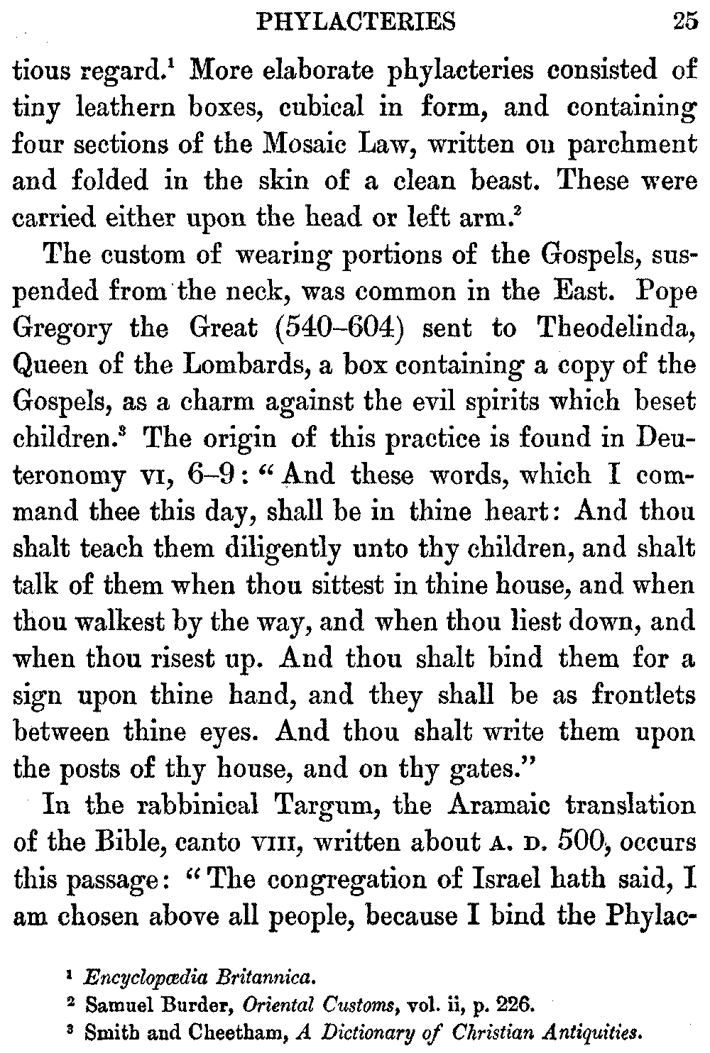 Origen (a. d. 186-253), a native of Alexandria, wrote that in his time it was customary for a person ailing from any cause to write certain characters on paper or metal, and fasten the amulet, thus improvised, upon the part of the body affected.[7:1] Passages from the books of the Gospel (literally "good spell") were especial favorites as such preservatives; they were usually inscribed on parchment, and were even placed upon horses.[7:2] Amulets were also employed to propitiate the goddess Fortune, and to thwart her evil designs. So insistent was the belief in the virtues of these objects, and to such a pitch of credulity did the popular mind attain, that special charms in great variety were devised against particular diseases, as well as against misfortunes and evil of whatever kind.[7:3]