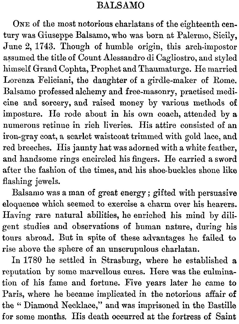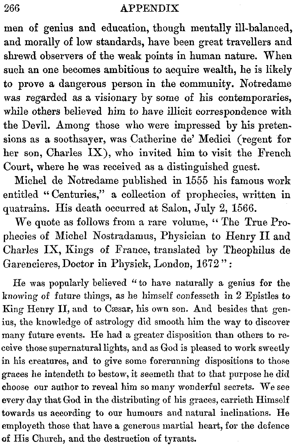 It is worthy of note that the most notorious quacks, often [266]men of genius and education, though mentally ill-balanced, and morally of low standards, have been great travellers and shrewd observers of the weak points in human nature. When such an one becomes ambitious to acquire wealth, he is likely to prove a dangerous person in the community. Notredame was regarded as a visionary by some of his contemporaries, while others believed him to have illicit correspondence with the Devil. Among those who were impressed by his pretensions as a soothsayer, was Catherine de' Medici (regent for her son, Charles IX), who invited him to visit the French Court, where he was received as a distinguished guest.
