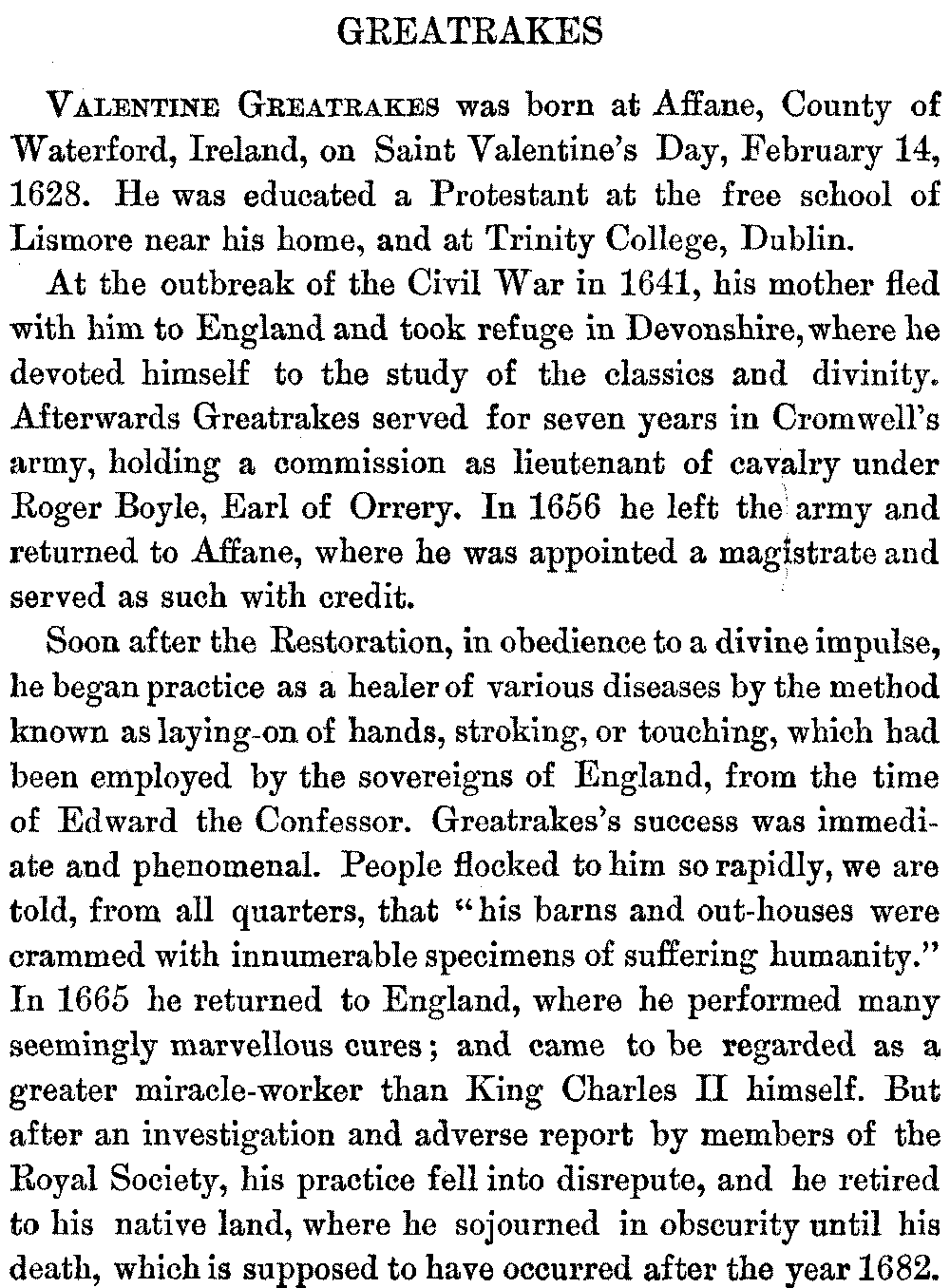 In 1666 the Chamberlain of the Worcester Corporation expended ten pounds, fourteen shillings in an entertainment for "Mr. Greatrix, an Irishman famous for helping and curing many lame and diseased people, only by stroking of their maladies with his hand and therefore sent for to this and many other places."