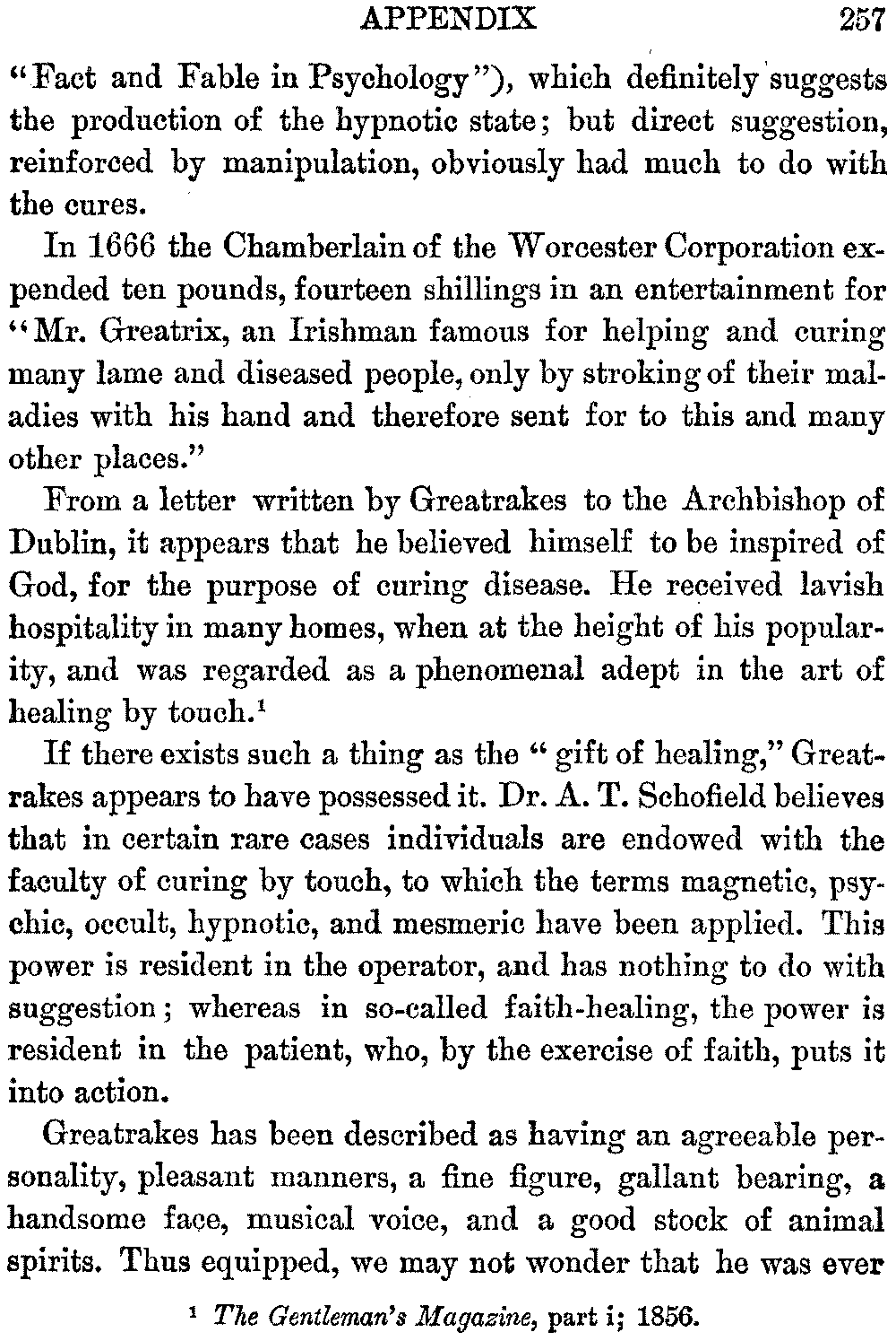 If there exists such a thing as the "gift of healing," Greatrakes appears to have possessed it. Dr. A. T. Schofield believes that in certain rare cases individuals are endowed with the faculty of curing by touch, to which the terms magnetic, psychic, occult, hypnotic, and mesmeric have been applied. This power is resident in the operator, and has nothing to do with suggestion; whereas in so-called faith-healing, the power is resident in the patient, who, by the exercise of faith, puts it into action.