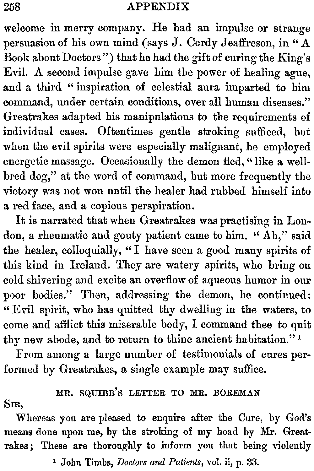 It is narrated that when Greatrakes was practising in London, a rheumatic and gouty patient came to him. "Ah," said the healer, colloquially, "I have seen a good many spirits of this kind in Ireland. They are watery spirits, who bring on cold shivering and excite an overflow of aqueous humor in our poor bodies." Then, addressing the demon, he continued: "Evil spirit, who has quitted thy dwelling in the waters, to come and afflict this miserable body, I command thee to quit thy new abode, and to return to thine ancient habitation."[258:1]