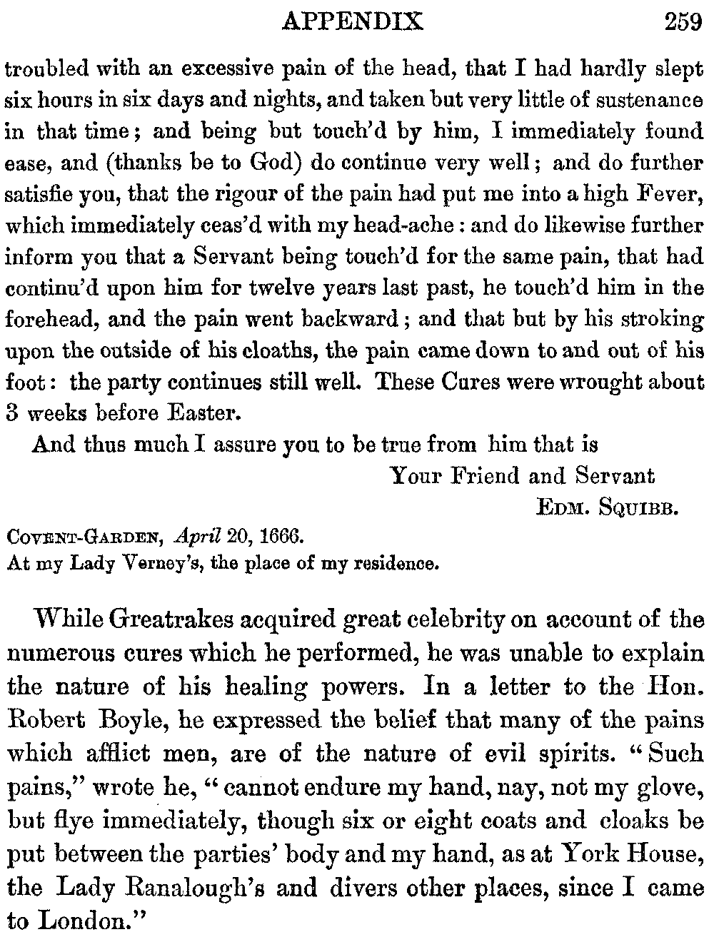 While Greatrakes acquired great celebrity on account of the numerous cures which he performed, he was unable to explain the nature of his healing powers. In a letter to the Hon. Robert Boyle, he expressed the belief that many of the pains which afflict men, are of the nature of evil spirits. "Such pains," wrote he, "cannot endure my hand, nay, not my glove, but flye immediately, though six or eight coats and cloaks be put between the parties' body and my hand, as at York House, the Lady Ranalough's and divers other places, since I came to London."