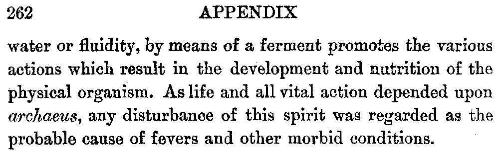 This has been defined as a spirit, or invisible man or animal, of ethereal substance, the counterpart of the visible body, within which it resides, and to which it imparts life, strength, and the power of assimilating food.[261:2] Archaeus was regarded as the creative spirit, which, working upon the raw material of [262]water or fluidity, by means of a ferment promotes the various actions which result in the development and nutrition of the physical organism. As life and all vital action depended upon archaeus, any disturbance of this spirit was regarded as the probable cause of fevers and other morbid conditions.