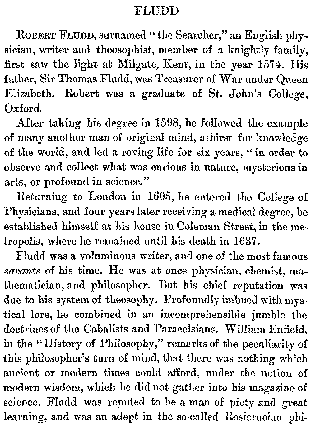 Robert Fludd, surnamed "the Searcher," an English physician, writer and theosophist, member of a knightly family, first saw the light at Milgate, Kent, in the year 1574. His father, Sir Thomas Fludd, was Treasurer of War under Queen Elizabeth. Robert was a graduate of St. John's College, Oxford.
