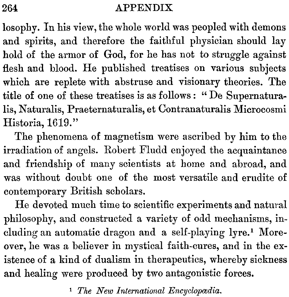 Fludd was a voluminous writer, and one of the most famous savants of his time. He was at once physician, chemist, mathematician, and philosopher. But his chief reputation was due to his system of theosophy. Profoundly imbued with mystical lore, he combined in an incomprehensible jumble the doctrines of the Cabalists and Paracelsians. William Enfield, in the "History of Philosophy," remarks of the peculiarity of this philosopher's turn of mind, that there was nothing which ancient or modern times could afford, under the notion of modern wisdom, which he did not gather into his magazine of science. Fludd was reputed to be a man of piety and great learning, and was an adept in the so-called Rosicrucian [264]philosophy. In his view, the whole world was peopled with demons and spirits, and therefore the faithful physician should lay hold of the armor of God, for he has not to struggle against flesh and blood. He published treatises on various subjects which are replete with abstruse and visionary theories. The title of one of these treatises is as follows: "De Supernaturalis, Naturalis, Praeternaturalis, et Contranaturalis Microcosmi Historia, 1619."