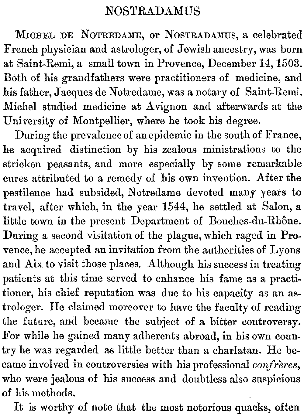 During the prevalence of an epidemic in the south of France, he acquired distinction by his zealous ministrations to the stricken peasants, and more especially by some remarkable cures attributed to a remedy of his own invention. After the pestilence had subsided, Notredame devoted many years to travel, after which, in the year 1544, he settled at Salon, a little town in the present Department of Bouches-du-Rhône. During a second visitation of the plague, which raged in Provence, he accepted an invitation from the authorities of Lyons and Aix to visit those places. Although his success in treating patients at this time served to enhance his fame as a practitioner, his chief reputation was due to his capacity as an astrologer. He claimed moreover to have the faculty of reading the future, and became the subject of a bitter controversy. For while he gained many adherents abroad, in his own country he was regarded as little better than a charlatan. He became involved in controversies with his professional confrères, who were jealous of his success and doubtless also suspicious of his methods.