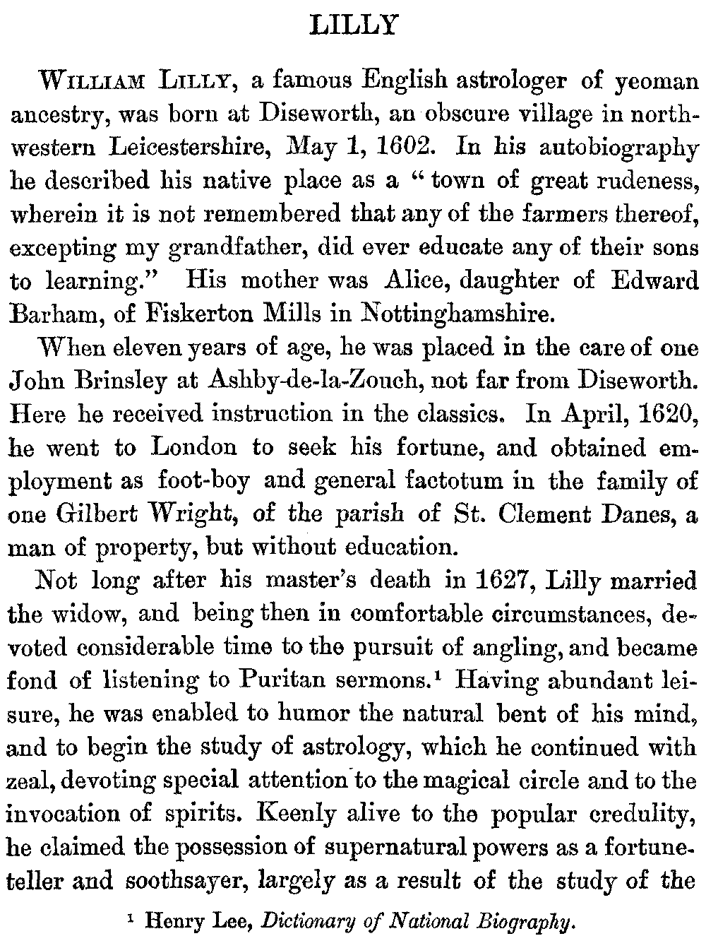 William Lilly, a famous English astrologer of yeoman ancestry, was born at Diseworth, an obscure village in northwestern Leicestershire, May 1, 1602. In his autobiography he described his native place as a "town of great rudeness, wherein it is not remembered that any of the farmers thereof, excepting my grandfather, did ever educate any of their sons to learning." His mother was Alice, daughter of Edward Barham, of Fiskerton Mills in Nottinghamshire.