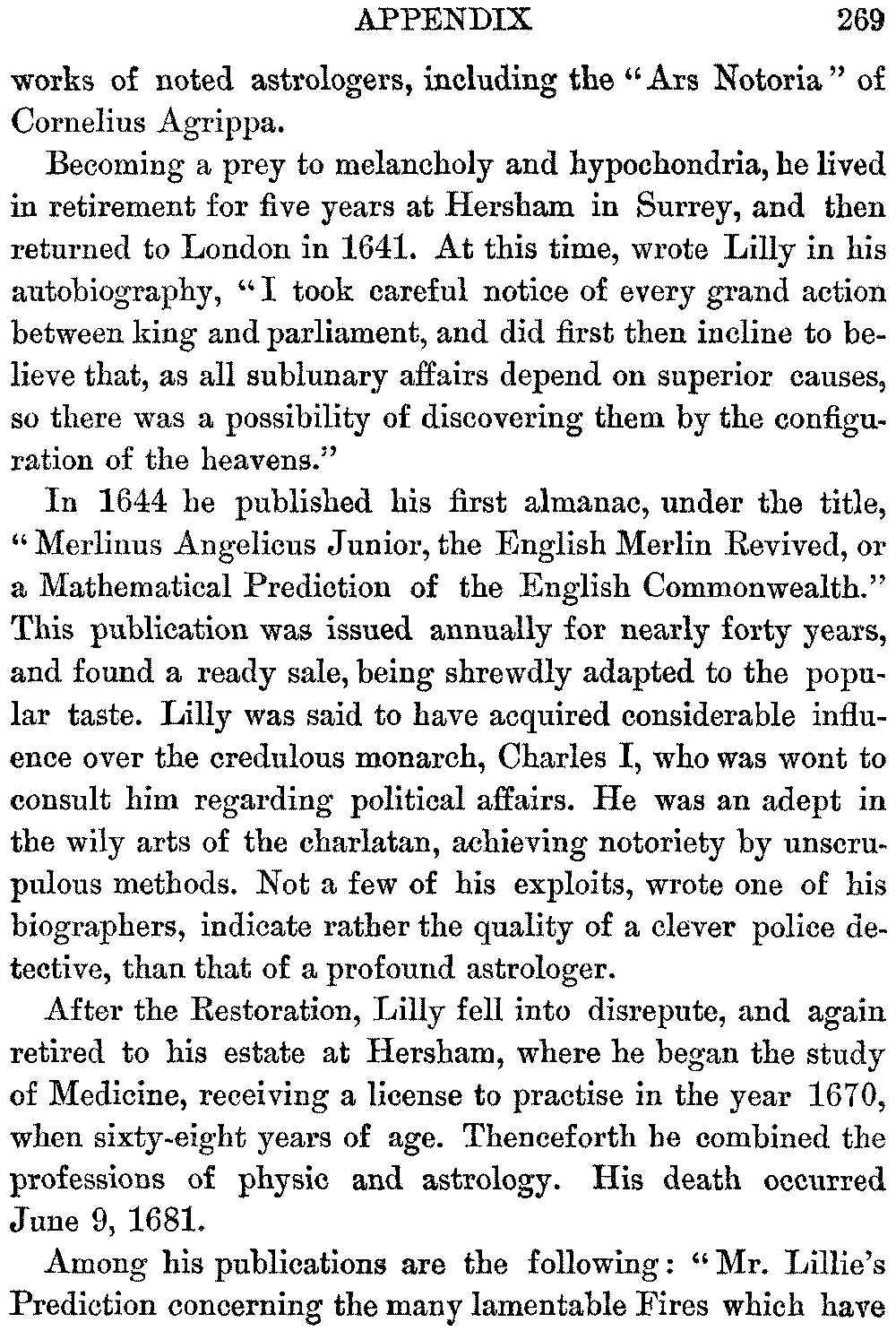 Not long after his master's death in 1627, Lilly married the widow, and being then in comfortable circumstances, devoted considerable time to the pursuit of angling, and became fond of listening to Puritan sermons.[268:1] Having abundant leisure, he was enabled to humor the natural bent of his mind, and to begin the study of astrology, which he continued with zeal, devoting special attention to the magical circle and to the invocation of spirits. Keenly alive to the popular credulity, he claimed the possession of supernatural powers as a fortune-teller and soothsayer, largely as a result of the study of the [269]works of noted astrologers, including the "Ars Notoria" of Cornelius Agrippa.