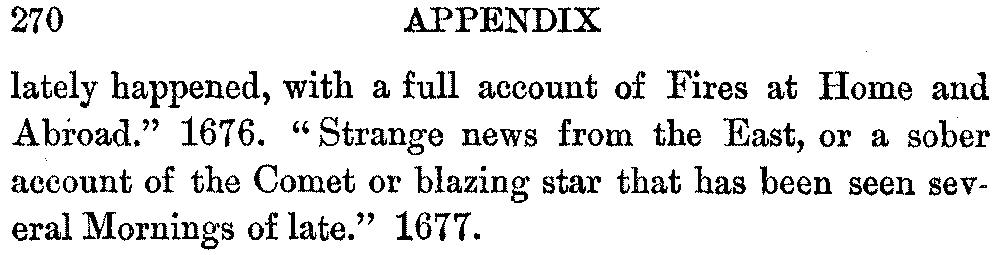Among his publications are the following: "Mr. Lillie's Prediction concerning the many lamentable Fires which have [270]lately happened, with a full account of Fires at Home and Abroad." 1676. "Strange news from the East, or a sober account of the Comet or blazing star that has been seen several Mornings of late." 1677.