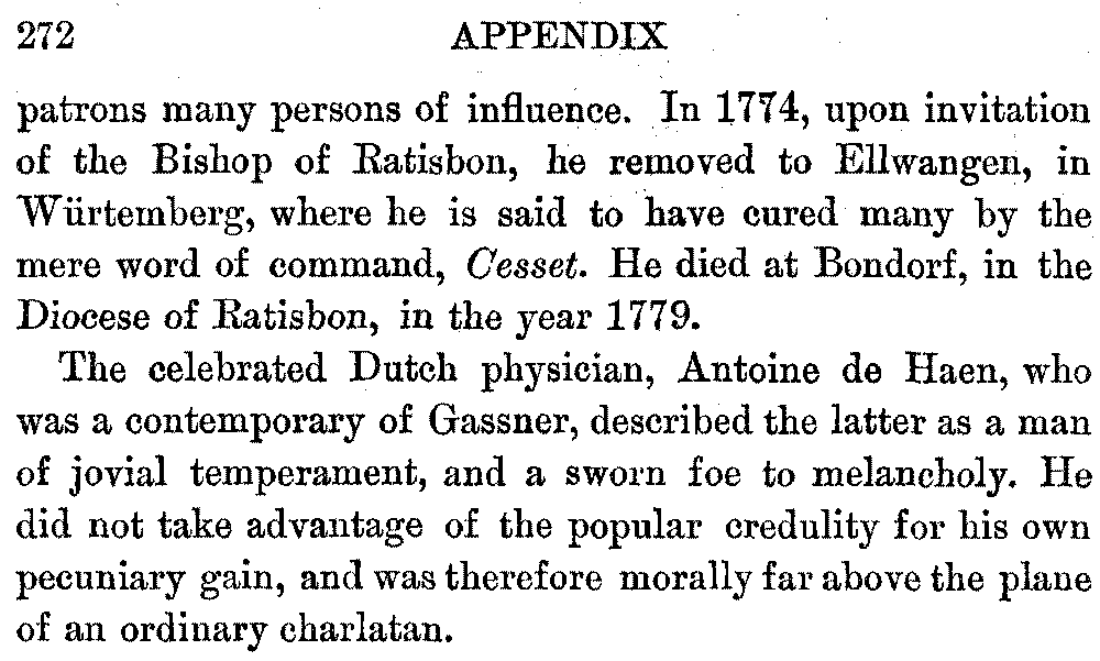 Gassner's reputation as a thaumaturge spread throughout Germany and adjacent countries, and he numbered among his [272]patrons many persons of influence. In 1774, upon invitation of the Bishop of Ratisbon, he removed to Ellwangen, in Würtemberg, where he is said to have cured many by the mere word of command, Cesset. He died at Bondorf, in the Diocese of Ratisbon, in the year 1779.