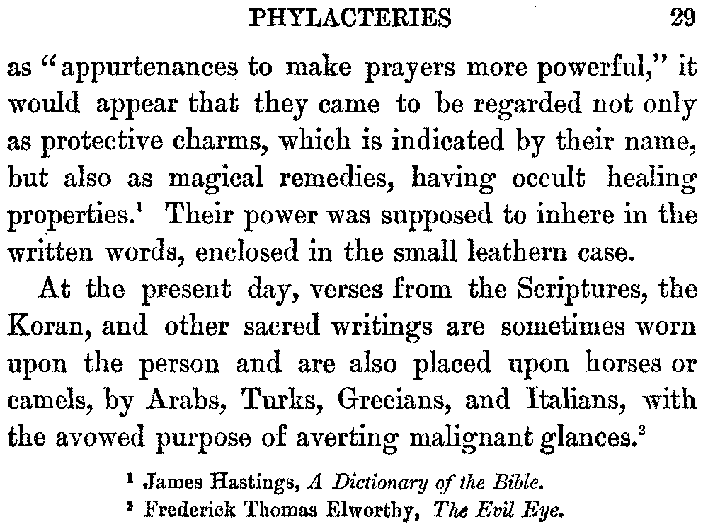 Satisfactorily to explain the derivation of the English word "amulet" has taxed the ingenuity of etymologists, and its origin is admittedly obscure. According to some authorities, the Latin amuletum was derived from amoliri, to avert or repel; but the greater weight of evidence points to the Arabic verb hamala, meaning "to carry." The definitions usually given embody [4]both of these ideas; for amulets, in the ancient medical conception of the term, were any objects, ornamental or otherwise, worn on the bodies of men or animals, and believed to neutralize the ill effects of noxious drugs, incantations, witchcrafts, and all morbific agencies whatever.[4:1] To the Oriental mind amulets symbolize the bond between a protective power and dependent mundane creatures; they are prophylactics against the forces of evil, and may be properly characterized as objects superstitiously worn, whose alleged magical potency is derived from the faith and imagination of the wearer.[4:2]