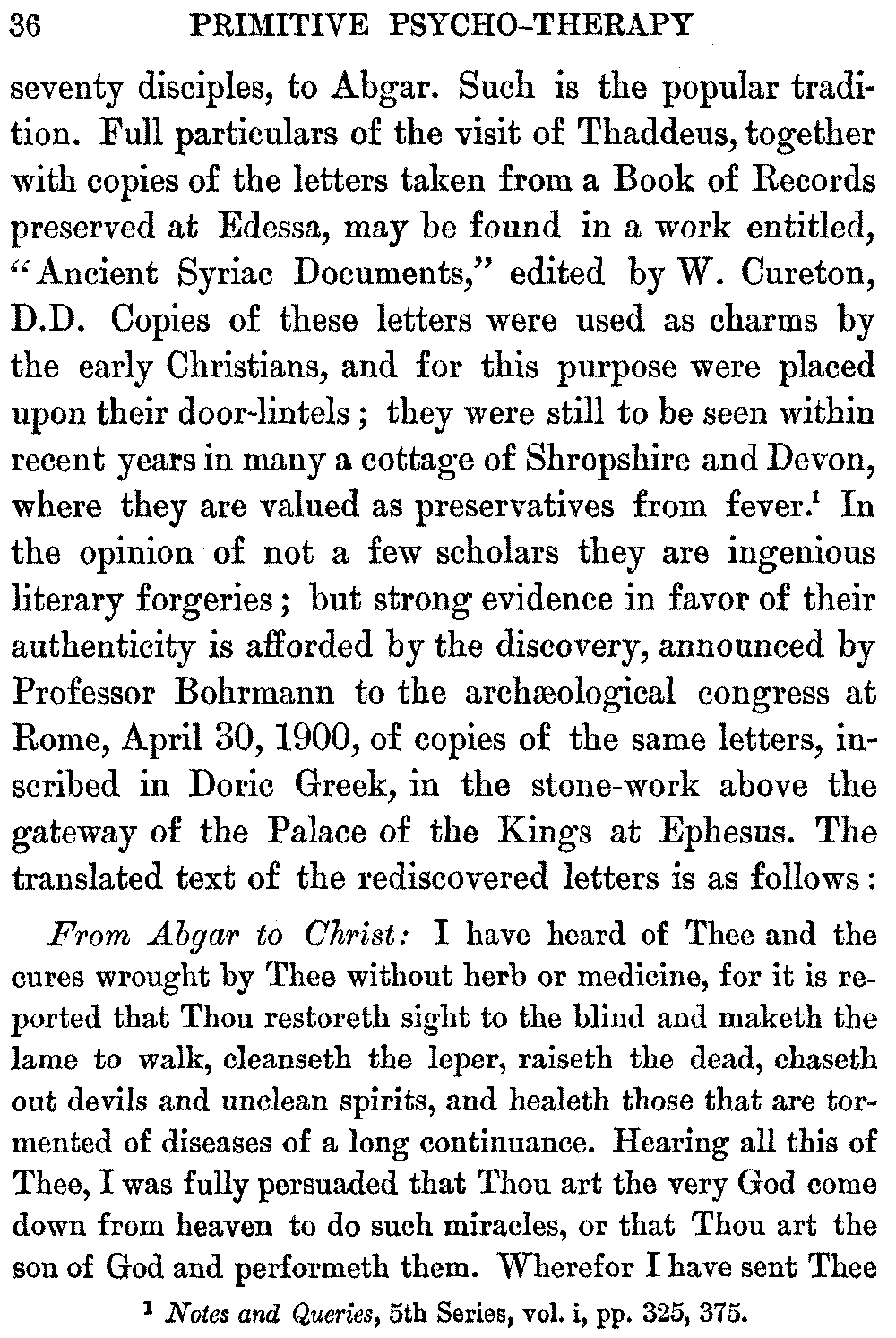 Charm-magic, or the cure of disease through the instrumentality of written medical charms, may be properly classed as one method of utilizing the therapeutic force of suggestion. In ancient Assyria sacred inscriptions were placed upon the walls of the sick-room, and holy texts were displayed on either side of the threshold.