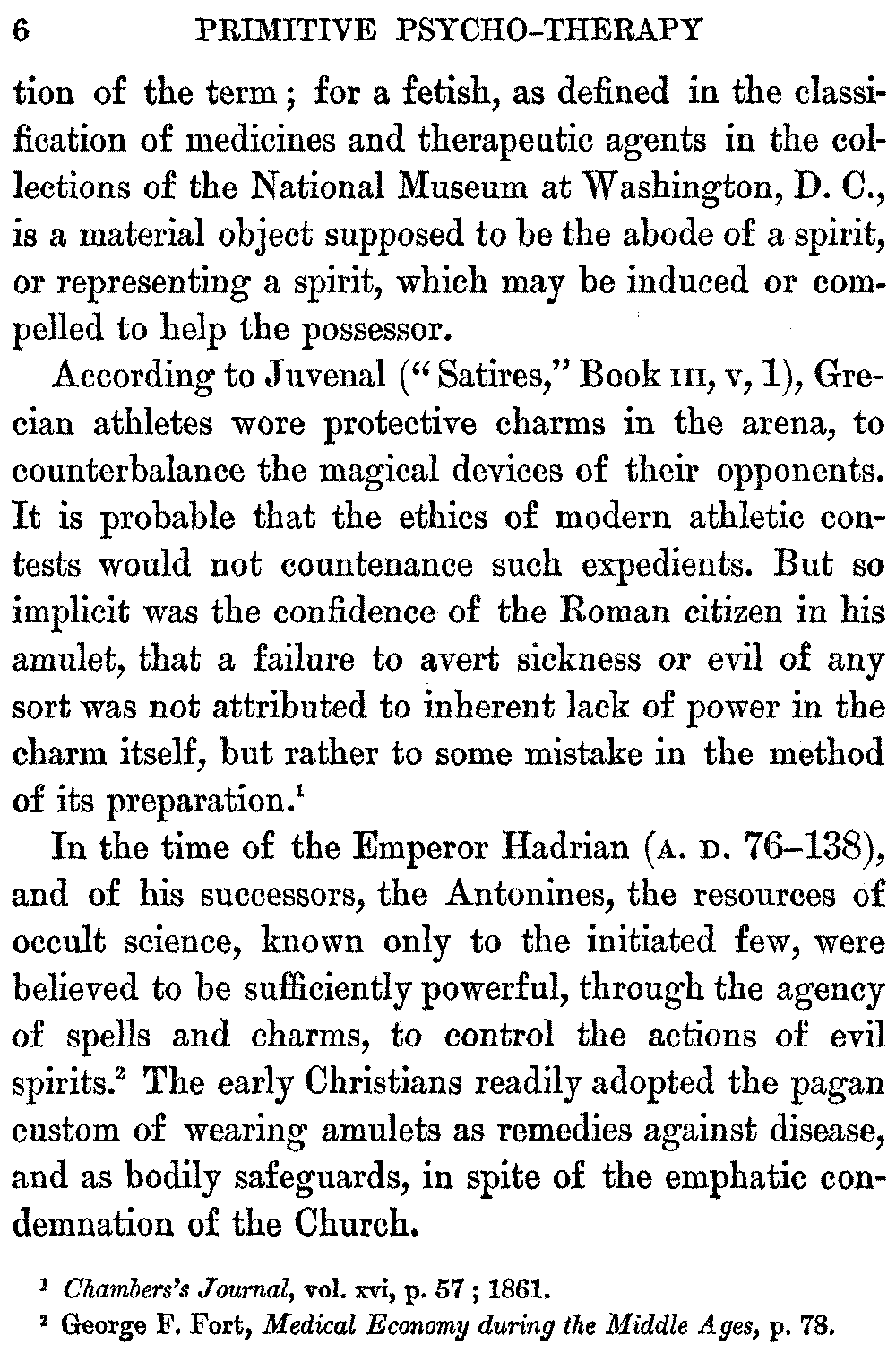 According to Juvenal ("Satires," Book iii, v, 1), Grecian athletes wore protective charms in the arena, to counterbalance the magical devices of their opponents. It is probable that the ethics of modern athletic contests would not countenance such expedients. But so implicit was the confidence of the Roman citizen in his amulet, that a failure to avert sickness or evil of any sort was not attributed to inherent lack of power in the charm itself, but rather to some mistake in the method of its preparation.[6:1]