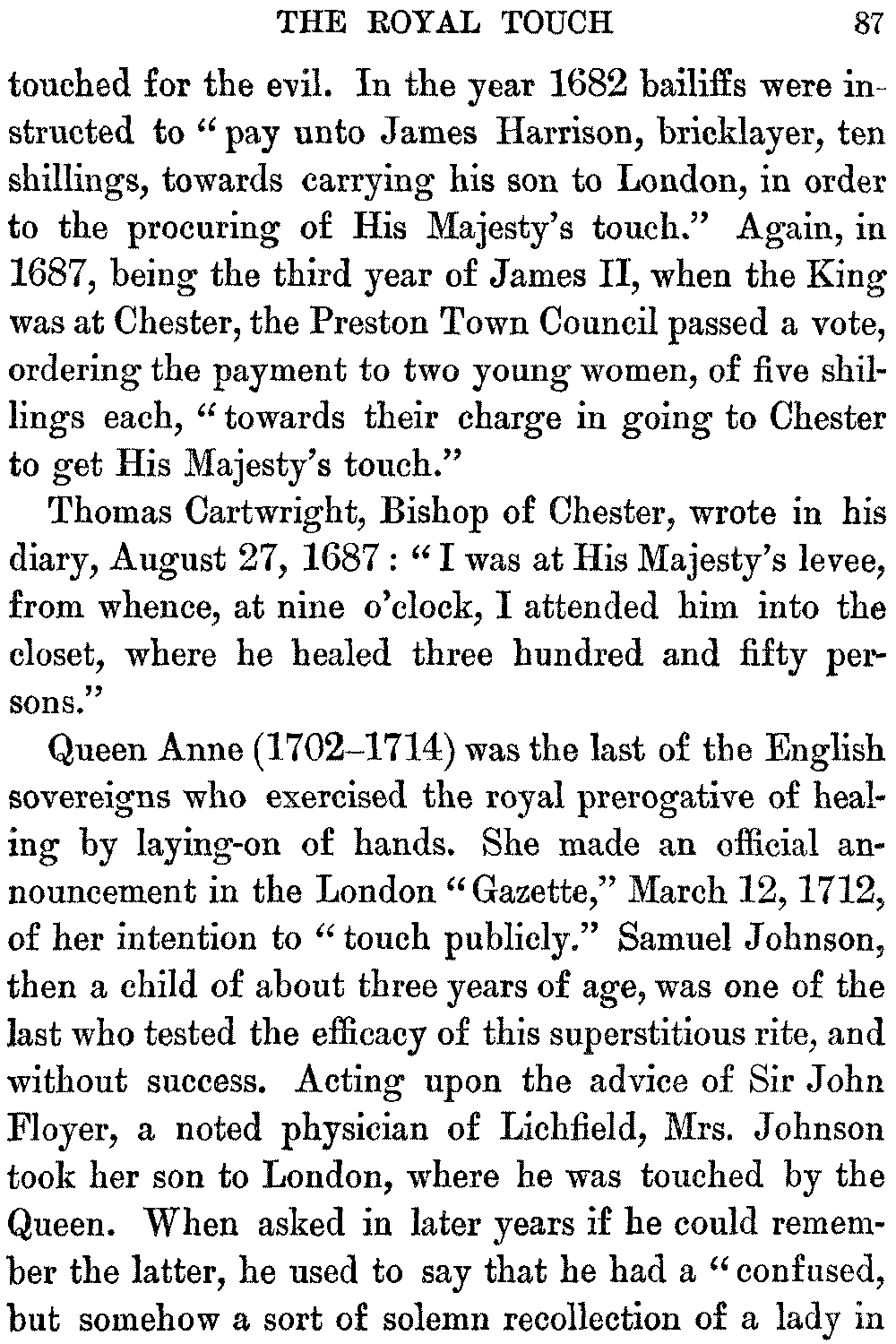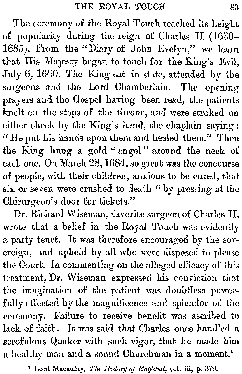 Soon after the Restoration, in obedience to a divine impulse, he began practice as a healer of various diseases by the method known as laying-on of hands, stroking, or touching, which had been employed by the sovereigns of England, from the time of Edward the Confessor. Greatrakes's success was immediate and phenomenal. People flocked to him so rapidly, we are told, from all quarters, that "his barns and out-houses were crammed with innumerable specimens of suffering humanity." In 1665 he returned to England, where he performed many seemingly marvellous cures; and came to be regarded as a greater miracle-worker than King Charles II himself. But after an investigation and adverse report by members of the Royal Society, his practice fell into disrepute, and he retired to his native land, where he sojourned in obscurity until his death, which is supposed to have occurred after the year 1682. [256]One David Lloyd, a biographer, issued a tract entitled "Wonders no Miracles, or Mr. Valentine Greatrakes' Gift of Healing Examined," wherein he endeavored to show that the famous "Irish stroaker" was little better than an impostor. In reply to this, Greatrakes published a pamphlet, vindicating his methods, with testimonials from persons of quality and distinction.