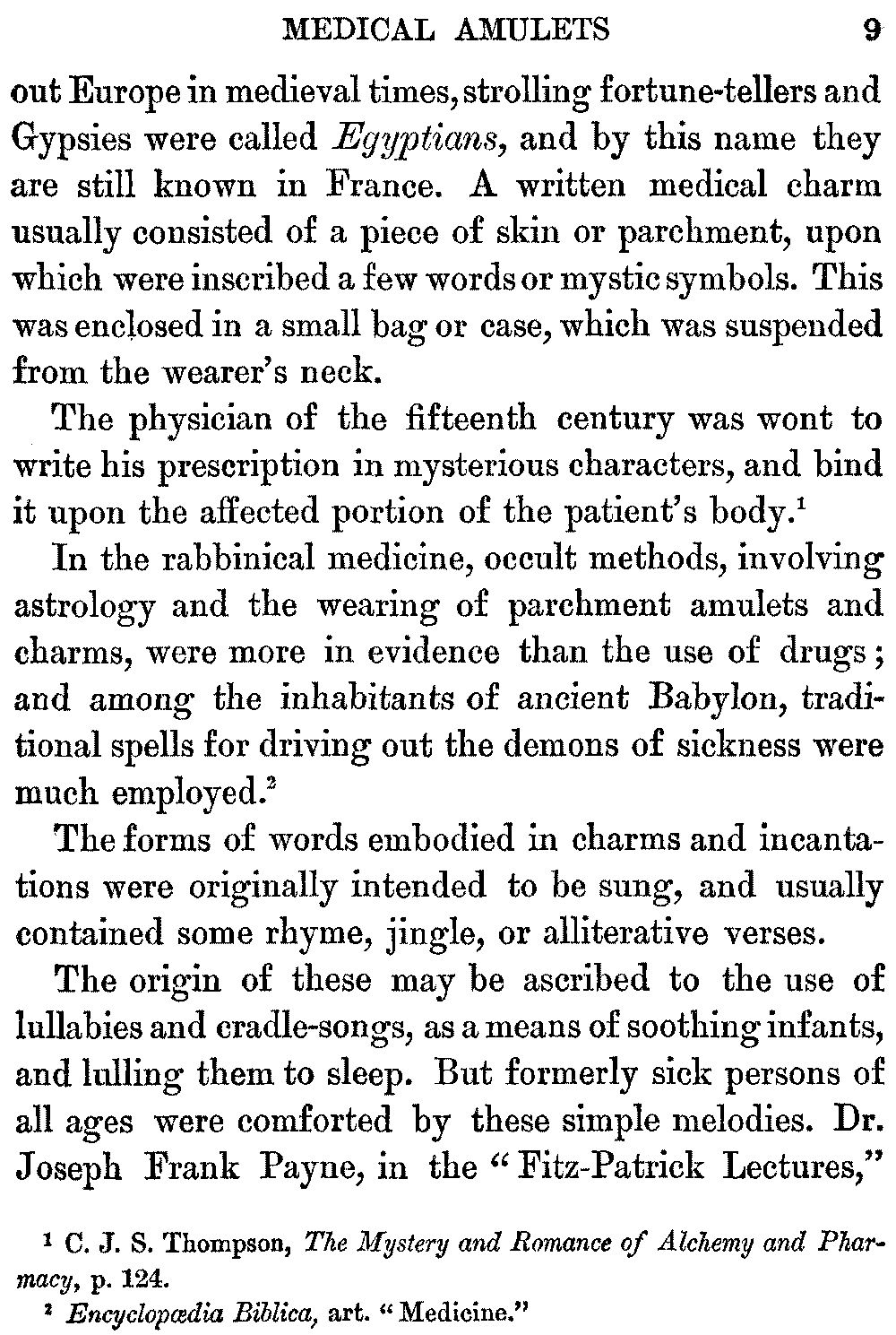 Amulets and charms were much in vogue in ancient Egypt, and so great was the traditional reputation of the people of that country, as expert magicians, that throughout [9]Europe in medieval times, strolling fortune-tellers and Gypsies were called Egyptians, and by this name they are still known in France. A written medical charm usually consisted of a piece of skin or parchment, upon which were inscribed a few words or mystic symbols. This was enclosed in a small bag or case, which was suspended from the wearer's neck.