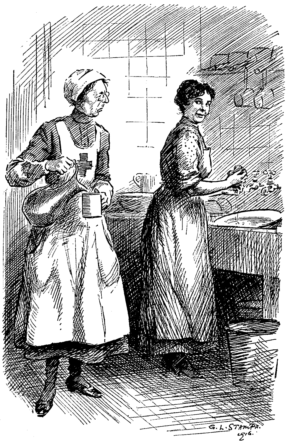 V.A.D. wardmaid, M.A. (to kitchen-maid). "I'm really a University lecturer; but at a time like this we are all human beings."
