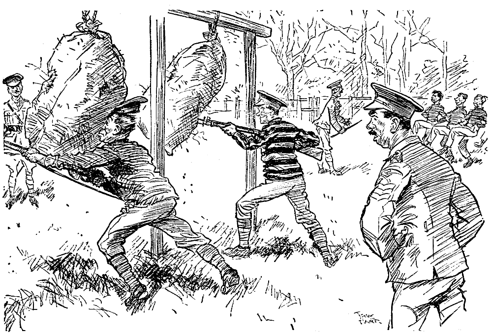 Disgusted Instructor. "Now then, none o' them peace tactics! 'Ere I'm trying to teach yer 'ow to kill the enemy, and yer goes and kisses 'im!"