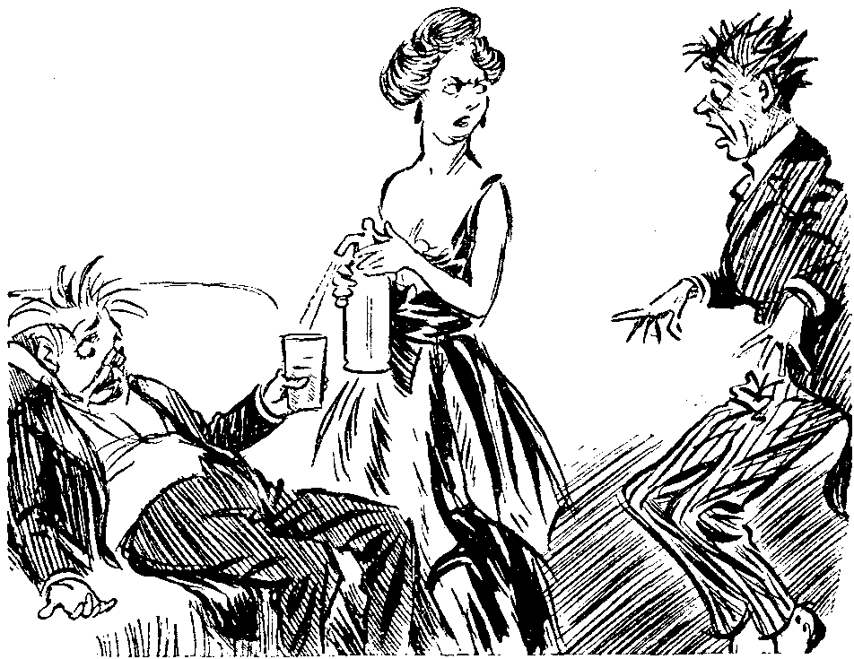 A later hour of the same day finds our heroine on her sofa, languid from the morning's emotions, and indulging in the luxury of not feeling at all well. Her world is crumbling. She cannot do without a slave, and Robert can no longer fill quite the old rôle. Clearly a matter for counsel with her physician and friend, Dr. Cornish (Mr. Dion Boucicault), who pleasantly diagnoses middle-age and prescribes a young adorer, than which no advice could be more nicely calculated to restore her lost feeling of queenly complacency. She sends for young Rex Cunningham (Mr. Martin Lewis), a morbid egoist, who nourishes a hopeless passion for her (and others), being well aware of the paramount claims of Robert. She contrives to let him know that she is free, and the youth, whose pet hobby is hopeless passion, at once sheers off in alarm. Caroline is learning—is beginning to understand the dark philosophy of Mr. Somerset Maugham. In despair she again turns to Robert. They become engaged and promptly begin quarrelling about their houses. He objects to her Futurist bathroom; she to his, which is so like a tube station that she would bathe in constant apprehension of the sudden appearance of a young man demanding tickets. Robert begins to assert his masculine rights to control these and sundry matters. She realises (oh, venerable gag of the cynics!) that the fetters which would unite their bodies would put a barrier between their souls. The engagement is by mutual consent declared off.