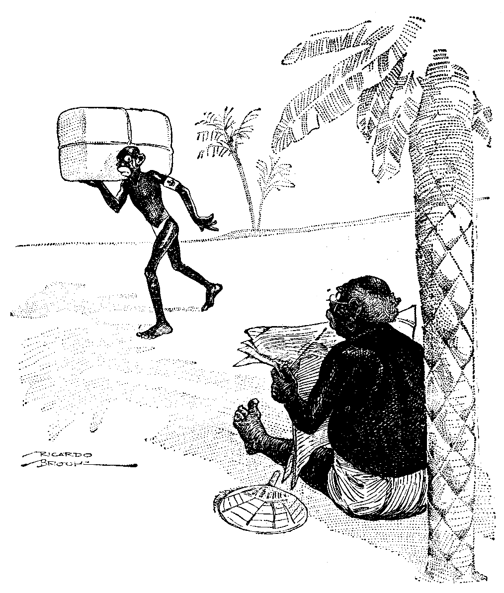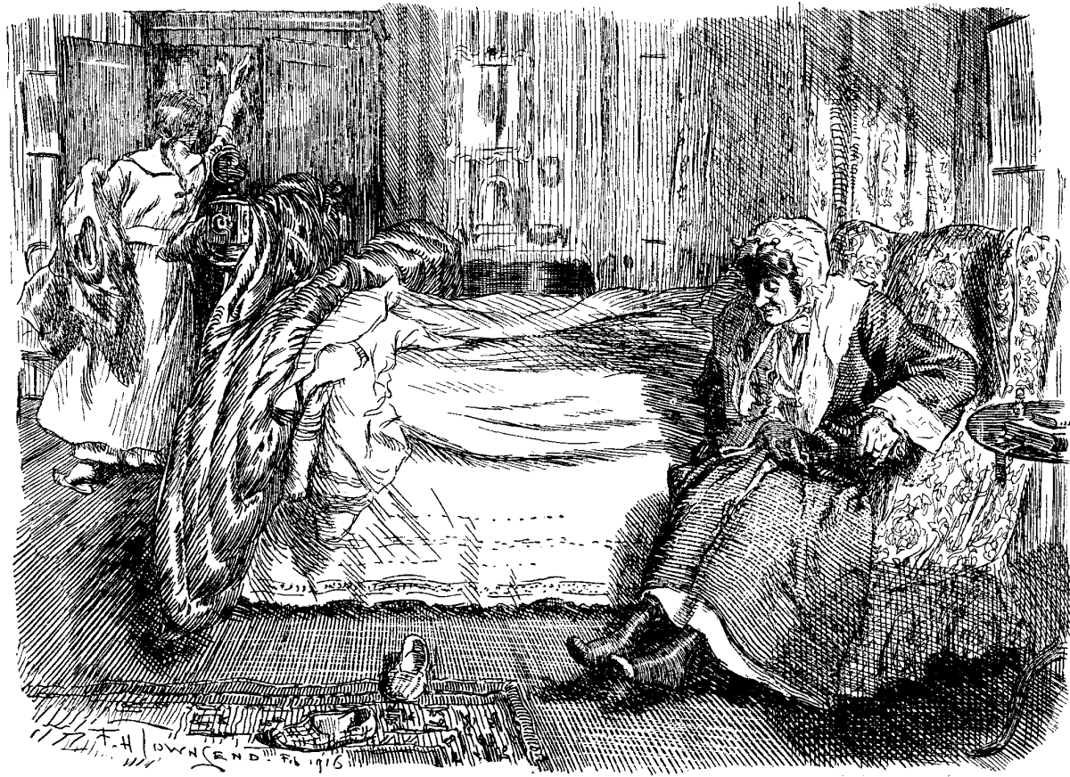 With the help of a clever photographer and some imagination we've reconstructed the up-and-down girl's adventures quite nicely. There are photos of the King of Rowdydaria as head of his own army; in his uniform as Colonel of the Hun Räuberundmörder Regiment; and in the Arab burnous in which he is to lead an attack on Egypt. There's a photo of the up-and-down girl sweeping a passage and listening through a key-hole to a wonderful conversation between the King of R. and an Emperor who'd come to see him (luckily it was in English and she remembers every word): "You've got to say you did it." "But I haven't got any navy—I couldn't have done it." "I'll give you the submarine that did it—or lend it to you. There! now it's yours—for a time. You don't depend on the Neutralians for any supplies. So you can afford to tell them you did it—and be quick about it." "But you can't expect even the Neutralians to swallow that!" "Why, you fool, they'd swallow anything! That's the meaning of their phrase 'rubber-neck.'" There's a photo of the Queen of Rowdydaria coming up at this point, snatching the broom away, and beating the up-and-down girl with it, and calling her "Spying English Pig." Altogether, my dear, it's positively enthralling! Order your copy early, for people will be slaying each other for this book. Astounding Disclosures of an Up-and-down Girl in the Royal Palace at Bashbang will certainly quite quite eclipse those two other sensations, What a Buttons Overheard in the Imperial Pickelhaube Schloss and Amazing Revelations of a Tweeny in the Perhapsburg Hof.