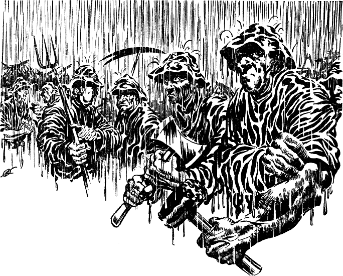 The dry wind came up at 0510, and by 0550, the entire village was on the march toward my station. Their intentions were quite easy to determine. They were armed with pitchforks, scythes, axes, and other tools which could be converted to offensive use. I established a protective screen, but realized that to set up a permanent defense would be impractical and even harmful. I therefore called the cruiser, requesting evacuation for myself and for young Forell. Prior to evacuation, I demolished all my fixed equipment, so that the only things left for the villagers to find when they entered the station were damaged remains of those things normal for a recluse scholar of their era.
