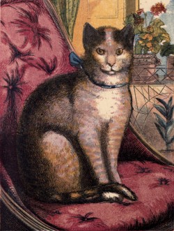 This is Pol-ly's own cat, Top-sy. She looks ve-ry prim and quiet; but if you play with her, you will find she is a ve-ry mer-ry lit-tle cat. She will jump up-on the ta-ble at break-fast, and run off with Pol-ly's toast; and if mam-ma be wri-ting a let-ter, Top-sy will steal soft-ly a-long the arm of the so-fa, and rub her paw o-ver the last word mam-ma has writ-ten, and make a great blot in the let-ter. Some-times she will sit as still as a mouse on Un-cle Tom's shoul-der while he is read-ing, and look so grave-ly on the book that you might think she was read-ing too: but she is not quite wise e-nough for that.