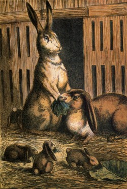 Rab-bits are pret-ty mild crea-tures. Some-times they live on moors, where they hide in bur-rows, which are holes in the ground, then they run about the fields and eat the green corn, and tur-nip tops, and some-times in win-ter are ve-ry hun-gry. But Har-ry's tame rab-bits have a warm house, and plen-ty of clean straw, and fresh food e-ve-ry day, and are as well off as rab-bits can be that are in pri-son. Har-ry goes in-to the fields to pick clo-ver and rib grass for them, the gar-den-er gives him let-tuce and cab-bage leaves; and he some-times gives them dry corn, for he likes them to have a change of food. The large, fine old rab-bit is call-ed Bun-ny. She is a great pet.