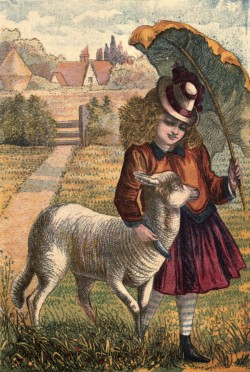 You see here Pol-ly and her Pet lamb. The mo-ther died in the cold wet wea-ther in spring, and the poor lit-tle lamb would have died too, but it was brought in-to the house and gi-ven to Pol-ly, who fed it with warm milk through the spout of her doll's tea-pot e-ve-ry day, till it grew so big that she used to bring it grass to eat. Pol-ly call-ed [10][9]her pet lamb Nan, and there nev-er was such a pet lamb. It fol-low-ed Pol-ly up stairs to the nur-se-ry, and down to the school-room, and round the fields when she walk-ed out; and Pol-ly said, “If Nan did grow to be a great sheep, she should nev-er be kill-ed for mut-ton.”