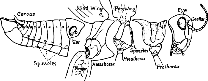 of ring-like segments.Insects are variously formed, but as a rule the mature ones have three and only three pairs of legs, one pair of feelers, one pair of large eyes, and one or two pairs of wings. The body is divided into a head, thorax and abdomen.[3] The head bears the eyes, feelers and mouth, the thorax bears the legs and wings, and the abdomen is made up of a number of segments. The presence of wings at once decides whether or not it is an insect, for, aside from bats and birds, insects alone have true wings. These are the distinguishing characters of the full grown insect, but, like birds, they hatch from eggs and while young do not always look like their parents. When young they may take on various shapes as caterpillars, borers, maggots, grubs, hoppers, and the like. Young insects are often difficult to distinguish from true worms, centipedes, snails, and such forms, but after one has collected and reared some of the young and watched them pass through the different stages and emerge with wings they are much more easily recognized.
