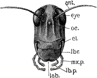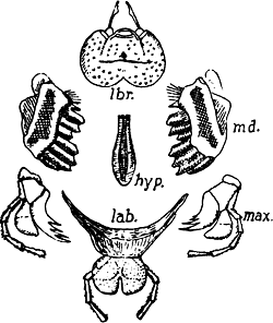 max., maxillae; lab., labium.Young insects as a rule are soft like caterpillars and maggots, while the old[4] ones usually have a hard body wall, similar to the beetles and wasps. The wings are usually thin and transparent though in some cases they are leathery or hard as in case of beetles or covered with scales as in the butterflies. The three pairs of legs are jointed and used for running, climbing, jumping, swimming, digging or grasping. The feelers or antennae are usually threadlike, clubbed, or resemble a feather[5] and extend forward or sidewise from the head. The large eyes are compound, being made up of many great small units which, when magnified, resemble honey-comb. In some cases two or three small bead-like eyes may be present besides the two large eyes. The mouth parts of insects may be formed for chewing, as in the grasshopper, or for sucking up liquids, as in the mosquito. The mouth of an[6] insect is built on an entirely different plan from our own. Chewing insects have an upper and lower lip and between these there are two pairs of grinding jaws. These jaws are hinged at the side of the face and when chewing they come together from either side so as to meet in the middle of the mouth. They therefore work sidewise rather than up and down. The mouth parts of the sucking insects are drawn out to form a sucking tube or proboscis as in case of the butterfly or mosquito.