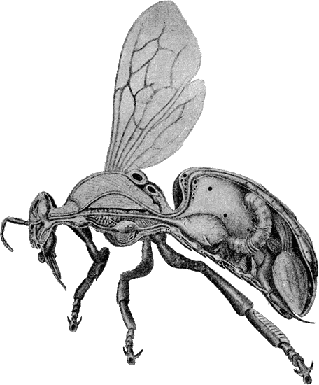 tip.The internal organs of insects are similar to those of other animals. The digestive tube consists of oesophagus, gizzard, or stomach, and intestines. The nervous system is well developed as shown by the extreme sensitiveness of insects to touch. The brain is comparatively small except in the bees and ants. The circulatory system consists simply of a long tube heart, the blood vessels being absent. In this way the internal organs of the insect are simply[8] bathed in the blood. The system of respiration is most complicated. The air is taken in through pores usually along the side of the body and is then carried through fine tracheal tubes to all parts of the body. You cannot drown an insect by putting its head under water, since it does not breathe through its mouth. The muscular system is similar to that of other animals which have the skeleton on the outside.