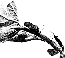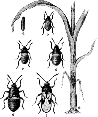 In a few days after they are laid they hatch and out of each crawls a small, long-legged blackish or greenish[103] young bug called the nymph. These little fellows usually stay in a crowd hiding on the under side of a leaf. After feeding for a time their leaf begins to turn yellow and soon dies. Then they move to a new leaf. As they feed they grow rapidly and after shedding their skins they change to the second nymph stage. This shedding of their skins or molting occurs five times before they mature. Of course each time before the old skin or suit of clothes is discarded a new one is developed beneath. The females may continue to deposit eggs for later clusters of young. They become most abundant on the crop late in the fall. Just before cold weather sets in the adults again seek winter shelter.