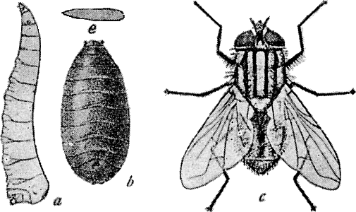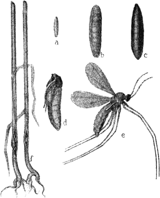 metamorphosis; a, egg; b, larva or maggot; c, flax-seed