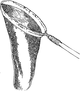 This method of catching insects will prove effective where nothing better is available, but any child can easily make a small insect net by attaching a loop of fairly stiff wire to a broom handle or other stick and sewing a bag of mosquito netting or other thin cloth to the wire. By means of such a net one can catch insects more easily and at[19] the same time there is less danger of tearing such insects as butterflies. Care must be taken in handling the stinging insects.