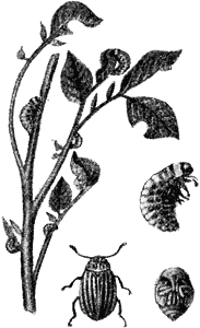 adult at side.This is one of the worst pests of the potato. As the name would imply it came originally from Colorado but is common now all over the country. The full grown insect is short and thick with a hard shell, striped with yellow and black. The grubs, on the other hand, are soft and red or orange with black spots. Both the grubs and the beetles feed on potatoes and often completely strip them of their leaves. Since they feed on foliage they can be very quickly destroyed by dusting or spraying the plants with a poison such as Paris green or arsenate of lead. The patches of yellow or reddish eggs are found mostly on the under side of the potato leaves. When the fat grubs are[84] full-fed they go into the ground and change to pupae and later to the striped beetles. This pest should not be mistaken for the so-called old-fashioned potato beetles which are long and slender and either bluish grey in color or striped with yellow and black. These are blister beetles and are entirely different.