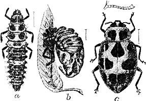 The grub of the lady-beetle is usually black or dull colored with red or yellow markings which make it very conspicuous. It runs about over foliage and is broad in front and tapers to a point behind. When the grub is full fed it attaches the top of its body[90] to a leaf, twig or other object and pupates. In the pupal stage it is often protected with spines and is able to lift the front end of the body up and down when disturbed, producing a light tapping sound.