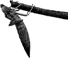 Collect several nymphs and keep them in a jar of water and study their movements and feeding habits. Disturb one with a pencil or straw and see how it darts forward. It has a water chamber in the large intestines, including also the respiratory tracheal gills, from which the water can be suddenly squirted which throws the insect forward. The escaping stream of water forces the insect forward on the same principle as the rotating lawn sprinkler. If you collect some almost mature nymphs and keep them for a time in a vessel of water you may see them crawl out of the water, shed their skin and change to winged adults. Collect a few adults of different species for pinning in your permanent collection.