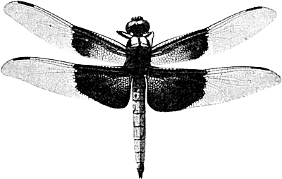 the last nymph stage.What child is there that is not familiar with the insect commonly known as the dragon-fly, snake doctor or snake feeder? Every lover of the stream or pond has seen these miniature aeroplanes darting now here, now there but ever retracing their airy flight along the water's edge or dipping in a sudden nose dive to skim its very surface. At times it is seen to rest lazily, wings out-stretched, perched on some projecting reed or other object. But when approached how suddenly it "takes off" and is out of reach. The dragon-fly is an almost perfect model of the modern monoplane. Its two long wings on either side are the planes, its head the nose, its thorax the fuselage and its long projecting abdomen[94] the tail or rudder. On wing the dragon-fly is one of the swiftest and most powerful insects. The dragon-flies are found all over the world being most abundant in the warmer regions where rainfall and bodies of water are abundant. For breeding they require water, their immature stages living under water feeding on aquatic animal life. Our present order of dragon-flies is the remains of an ancient race of insects of immense size. From fossil remains we learn that ancient dragon-flies[95] had a wing expanse of three feet.