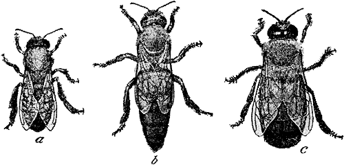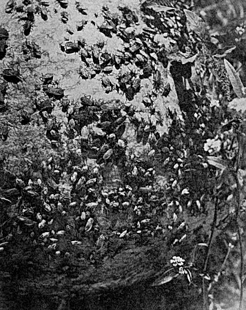 Dept. Agri.)The general habits of the bee are fairly well known by all. They live in colonies consisting largely of workers, one female or queen and males or drones. Whenever the number of workers becomes sufficiently large to warrant a division of the colony, a young queen is reared by the workers and just before she matures, the old queen leaves with about half of the workers to establish a new colony. This division of the colony is called swarming. If a hive, box or other acceptable home is not provided soon after the swarm comes out and clusters,[116] it may fly to the woods and establishes itself in a hollow tree where the regular work of honey gathering is continued. This accounts for so many bee-trees in the woods. The bee has been handled by man for ages, but it readily becomes wild when allowed to escape to the woods.