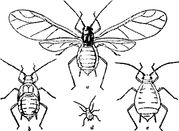 Dept. Agri.)In the garden examine and see if you can find lady-beetles or other parasites attacking the lice. Collect some of the enemies of the lice for your collection. Make a gallon of tobacco tea by soaking one pound of tobacco stems or waste tobacco in one gallon of water for a day or use one ounce[112] of forty per cent nicotine sulphate in three gallons of soap suds and spray or sprinkle infested bushes or vegetables with it. In an hour examine and see what effect it has had on the plant-lice. Nicotine is the most effective chemical for killing plant-lice. Do any of the lice develop wings? If so, how many? Wings develop on some of the lice at times when a plant or crop becomes too heavily infested by them. This enables some of the lice to spread to new food plants before old plants are completely destroyed and the colony of lice starved.