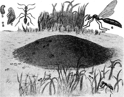 The ants are closely related to the bees and are similar to them in many respects. They live in colonies consisting of workers, drones, and a queen. The males or drones appear at swarming time and the workers are divided into various castes—warriors, guards, nurses, etc. Those families of ants, however, which seem to have what approaches real intelligence, far outstrip the bees in many respects. In some cases ants seem to be able to plan and carry out lines of work very much the same as man does. The various stages of human intelligence or races of men from the savage to the intelligent man are in a way similar to the various races of ants. There are ants which live as hunters, others which[124] live as shepherds and still others more highly developed which grow crops either in or near the nest as is the case with the fungus growing ants. This striking similarity between the development of ants and man offers ground for much speculation.