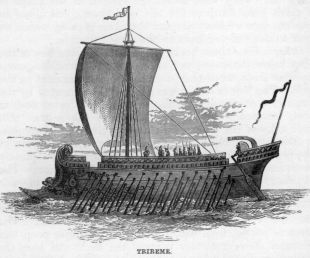 The Greeks possessed ships of war and merchant-vessels. That a war-galley was of large size may be inferred from the fact that she carried two hundred seamen, besides on some occasions thirty Epibatoe—literally, marines, trained to fight at sea. These war-vessels moved with wonderful rapidity, darting here and there with the speed of a modern steam-vessel. The ordinary war-ships were triremes, or had three banks of oars. The merchant-vessels or transports were much more bulky, had round bottoms, and although rowers were employed on board, yet they were propelled chiefly by their sails. After the time of Alexander, vessels with four, five, and even more ranks of rowers became general, and ships are described with twelve and even thirty ranks of rowers and upwards—but they were found of no practical use, as the crew on the upper benches were unable to throw sufficient power into the immensely long oars which it was necessary to employ.