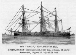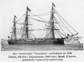 Other turret ships, however, had been built a year or two earlier with masts and sails, and bows of ordinary height. At first these ships were over-masted and canvassed, but after one of them, the Captain, capsized during a gale in the Bay of Biscay, this defect was remedied. This class was represented by the Monarch, completed in 1869, a vessel of 8930 tons, and 15 knots speed. She carried seven guns, those in the turrets weighing 25 tons.